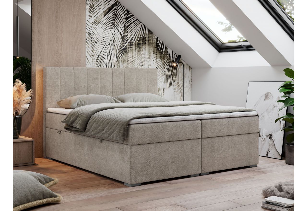 Główny materac kieszeniowy Multipocket dostarcza doskonałego wsparcia dla ciała, dzięki wysokoelastycznej piance T-30 co jest kluczowe dla zdrowego snu. Jego konstrukcja z niezależnymi kieszeniami minimalizuje przenoszenie ruchu. Dodatkowo, materac nawierzchniowy wykończony pianką T-25 zapewnia uczucie miękkości i komfortu, dostosowując się do kształtu ciała. Dwa pojemniki na pościel to praktyczne rozwiązanie, które pozwoli na łatwe przechowywanie pościeli i utrzymanie porządku. Automat na sprężynach sprawia, że otwieranie pojemników jest wygodne i szybkie. Tapicerowany zagłówek to prawdziwa ozdoba, która dodaje wnętrzu klasy i staje się centralnym punktem każdej sypialni.
