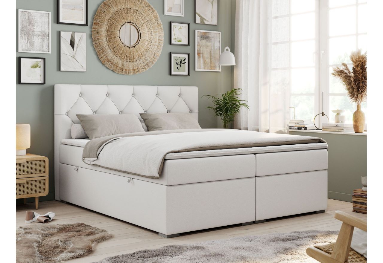 Główny materac kieszeniowy Multipocket dostarcza doskonałego wsparcia dla ciała, dzięki wysokoelastycznej piance T-30 co jest kluczowe dla zdrowego snu. Jego konstrukcja z niezależnymi kieszeniami minimalizuje przenoszenie ruchu. Dodatkowo, materac nawierzchniowy wykończony pianką T-25 zapewnia uczucie miękkości i komfortu, dostosowując się do kształtu ciała. Dwa pojemniki na pościel to praktyczne rozwiązanie, które pozwoli na łatwe przechowywanie pościeli i utrzymanie porządku. Automat na sprężynach sprawia, że otwieranie pojemników jest wygodne i szybkie. Tapicerowany zagłówek to prawdziwa ozdoba, która dodaje wnętrzu klasy i staje się centralnym punktem każdej sypialni.