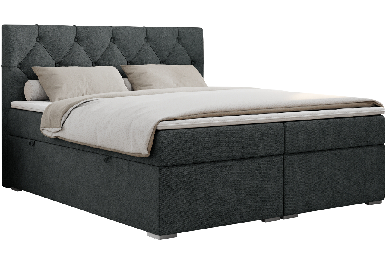 Główny materac kieszeniowy Multipocket dostarcza doskonałego wsparcia dla ciała, dzięki wysokoelastycznej piance T-30 co jest kluczowe dla zdrowego snu. Jego konstrukcja z niezależnymi kieszeniami minimalizuje przenoszenie ruchu. Dodatkowo, materac nawierzchniowy wykończony pianką T-25 zapewnia uczucie miękkości i komfortu, dostosowując się do kształtu ciała. Dwa pojemniki na pościel to praktyczne rozwiązanie, które pozwoli na łatwe przechowywanie pościeli i utrzymanie porządku. Automat na sprężynach sprawia, że otwieranie pojemników jest wygodne i szybkie. Tapicerowany zagłówek to prawdziwa ozdoba, która dodaje wnętrzu klasy i staje się centralnym punktem każdej sypialni.