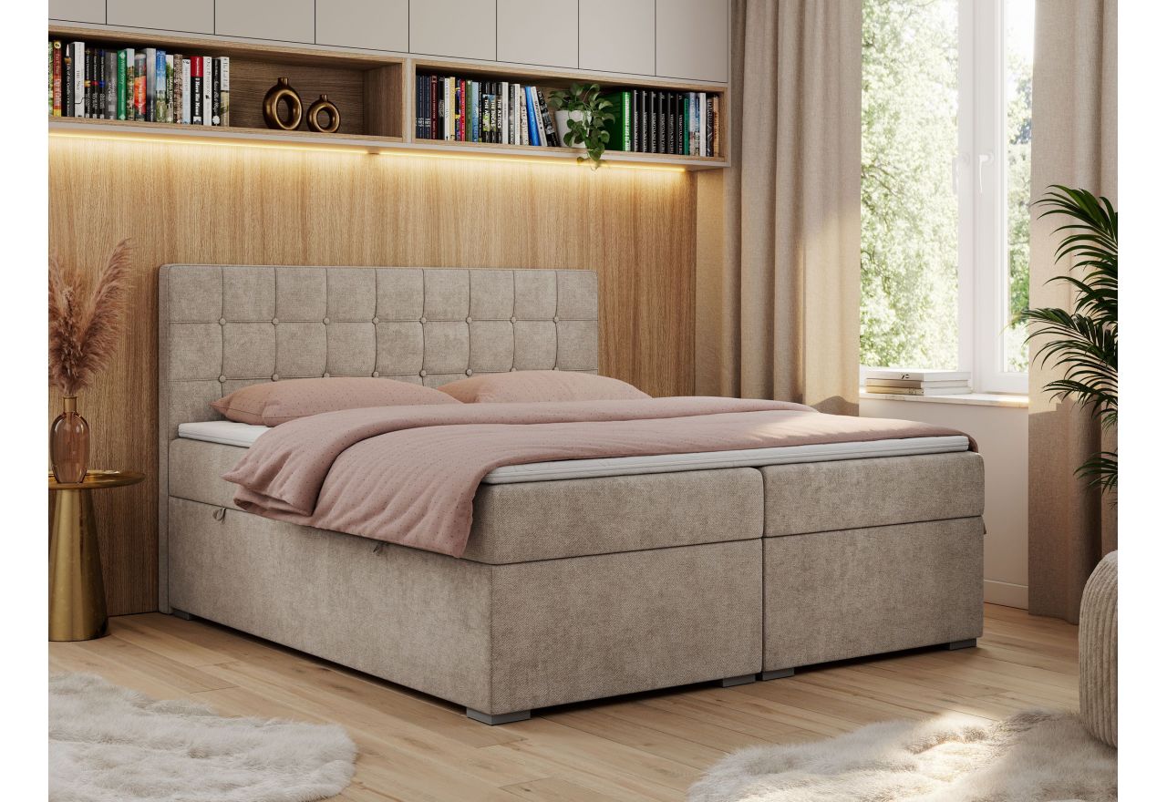 Główny materac kieszeniowy Multipocket dostarcza doskonałego wsparcia dla ciała, dzięki wysokoelastycznej piance T-30 co jest kluczowe dla zdrowego snu. Jego konstrukcja z niezależnymi kieszeniami minimalizuje przenoszenie ruchu. Dodatkowo, materac nawierzchniowy wykończony pianką T-25 zapewnia uczucie miękkości i komfortu, dostosowując się do kształtu ciała. Dwa pojemniki na pościel to praktyczne rozwiązanie, które pozwoli na łatwe przechowywanie pościeli i utrzymanie porządku. Automat na sprężynach sprawia, że otwieranie pojemników jest wygodne i szybkie. Tapicerowany zagłówek to prawdziwa ozdoba, która dodaje wnętrzu klasy i staje się centralnym punktem każdej sypialni.