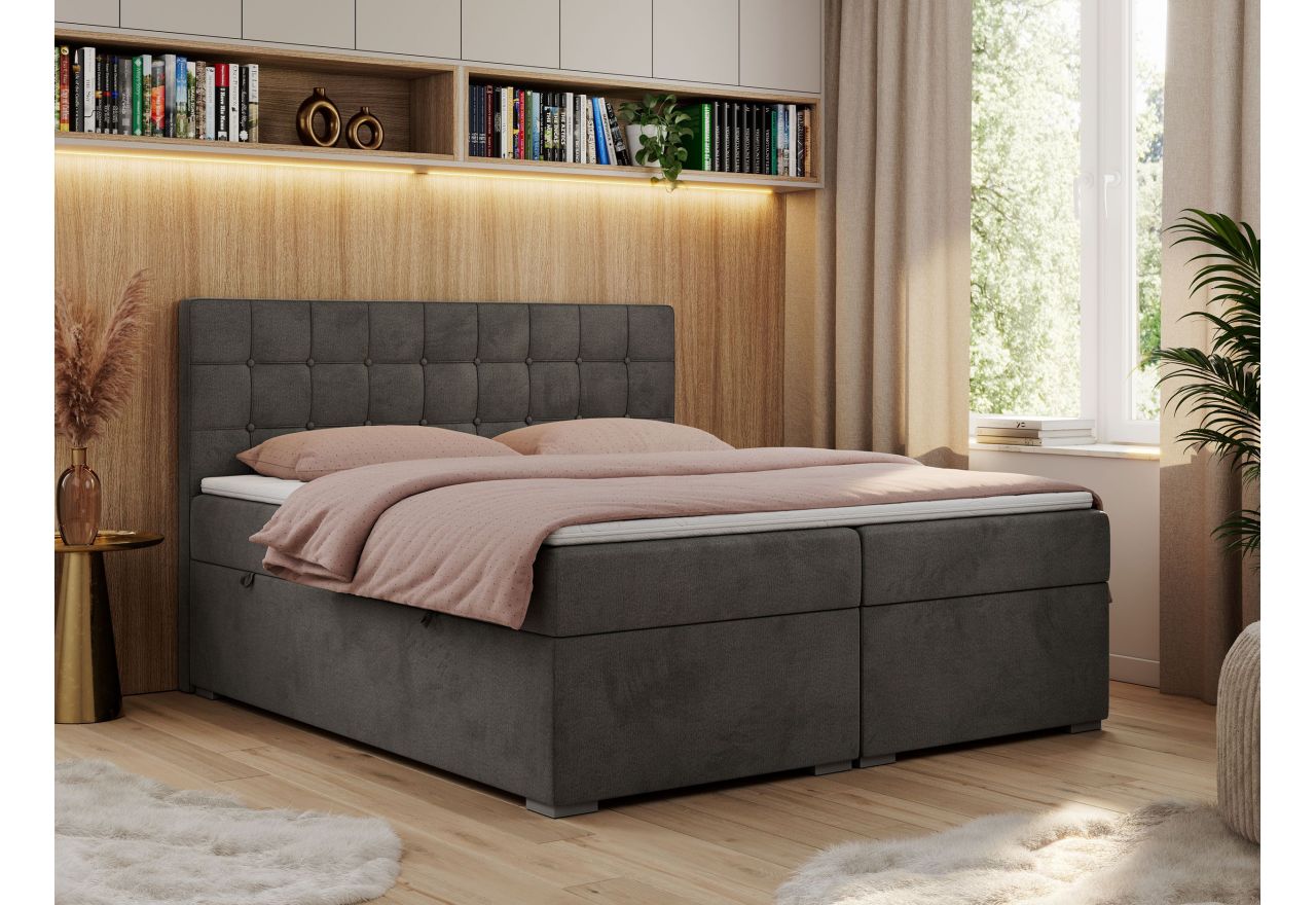 Główny materac kieszeniowy Multipocket dostarcza doskonałego wsparcia dla ciała, dzięki wysokoelastycznej piance T-30 co jest kluczowe dla zdrowego snu. Jego konstrukcja z niezależnymi kieszeniami minimalizuje przenoszenie ruchu. Dodatkowo, materac nawierzchniowy wykończony pianką T-25 zapewnia uczucie miękkości i komfortu, dostosowując się do kształtu ciała. Dwa pojemniki na pościel to praktyczne rozwiązanie, które pozwoli na łatwe przechowywanie pościeli i utrzymanie porządku. Automat na sprężynach sprawia, że otwieranie pojemników jest wygodne i szybkie. Tapicerowany zagłówek to prawdziwa ozdoba, która dodaje wnętrzu klasy i staje się centralnym punktem każdej sypialni.