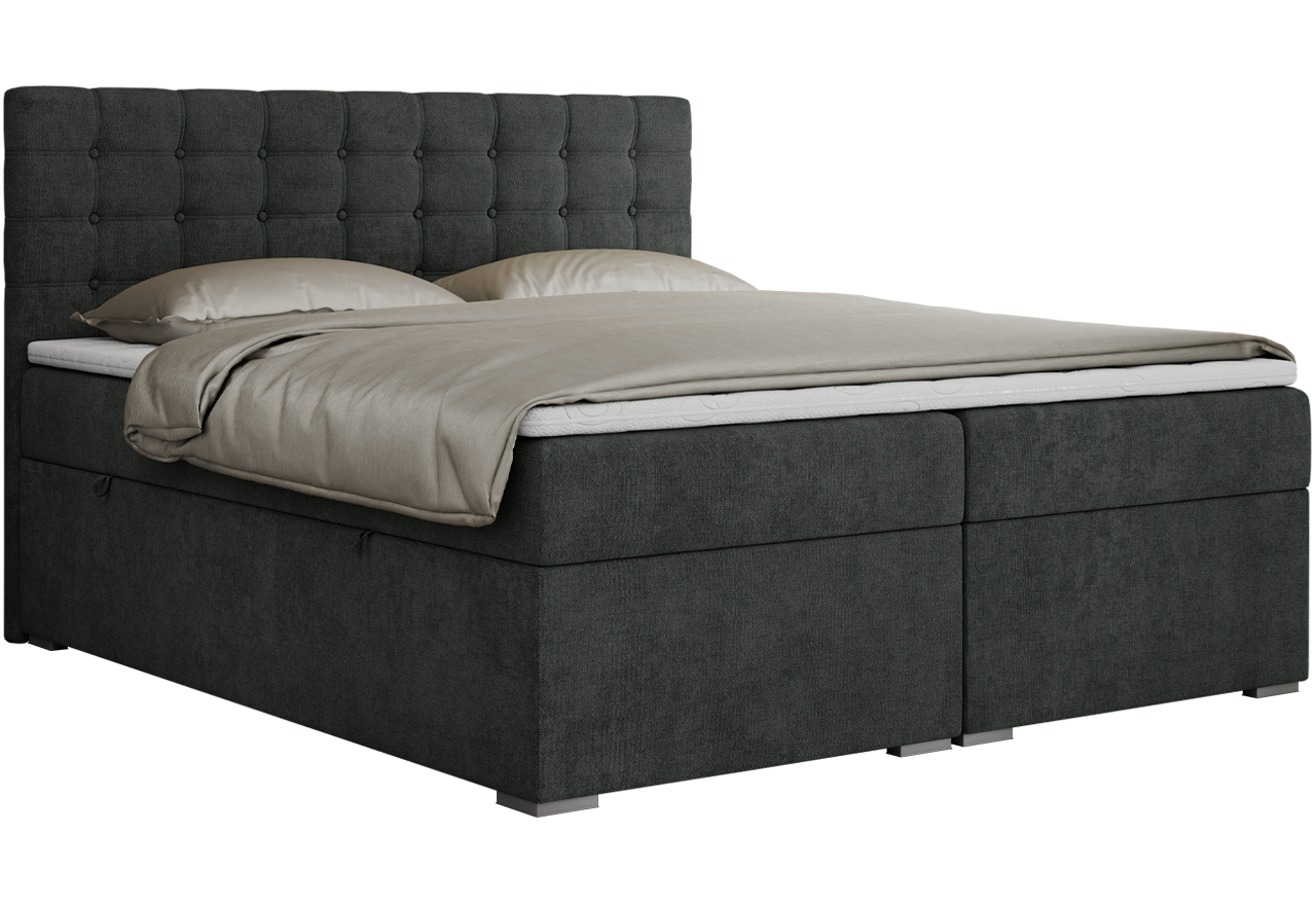 Główny materac kieszeniowy Multipocket dostarcza doskonałego wsparcia dla ciała, dzięki wysokoelastycznej piance T-30 co jest kluczowe dla zdrowego snu. Jego konstrukcja z niezależnymi kieszeniami minimalizuje przenoszenie ruchu. Dodatkowo, materac nawierzchniowy wykończony pianką T-25 zapewnia uczucie miękkości i komfortu, dostosowując się do kształtu ciała. Dwa pojemniki na pościel to praktyczne rozwiązanie, które pozwoli na łatwe przechowywanie pościeli i utrzymanie porządku. Automat na sprężynach sprawia, że otwieranie pojemników jest wygodne i szybkie. Tapicerowany zagłówek to prawdziwa ozdoba, która dodaje wnętrzu klasy i staje się centralnym punktem każdej sypialni.
