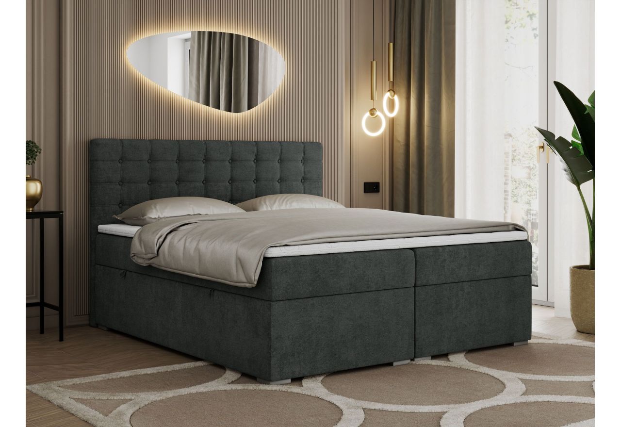 Główny materac kieszeniowy Multipocket dostarcza doskonałego wsparcia dla ciała, dzięki wysokoelastycznej piance T-30 co jest kluczowe dla zdrowego snu. Jego konstrukcja z niezależnymi kieszeniami minimalizuje przenoszenie ruchu. Dodatkowo, materac nawierzchniowy wykończony pianką T-25 zapewnia uczucie miękkości i komfortu, dostosowując się do kształtu ciała. Dwa pojemniki na pościel to praktyczne rozwiązanie, które pozwoli na łatwe przechowywanie pościeli i utrzymanie porządku. Automat na sprężynach sprawia, że otwieranie pojemników jest wygodne i szybkie. Tapicerowany zagłówek to prawdziwa ozdoba, która dodaje wnętrzu klasy i staje się centralnym punktem każdej sypialni.