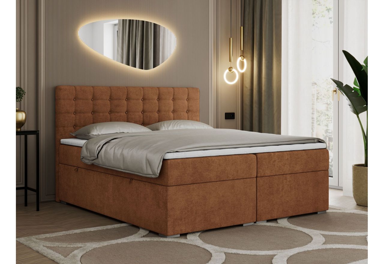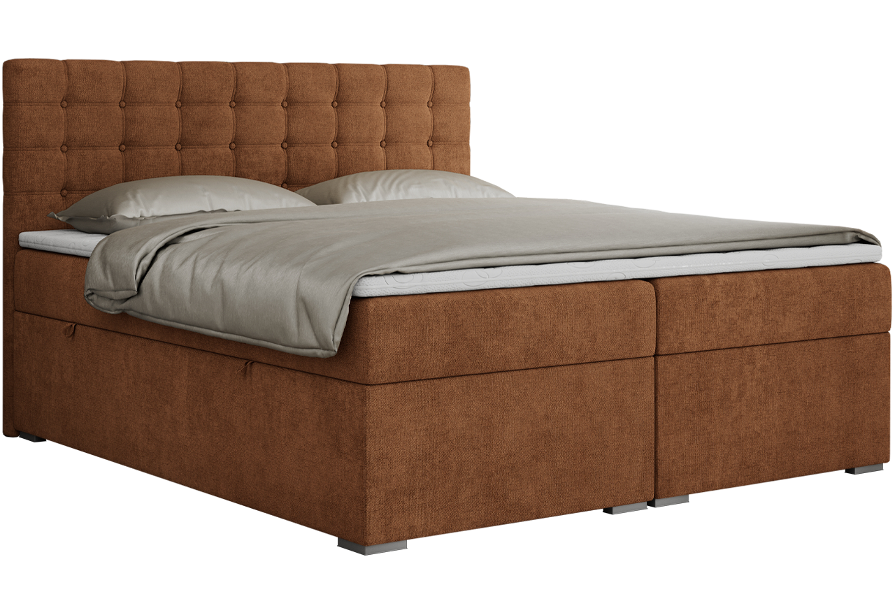 Główny materac kieszeniowy Multipocket dostarcza doskonałego wsparcia dla ciała, dzięki wysokoelastycznej piance T-30 co jest kluczowe dla zdrowego snu. Jego konstrukcja z niezależnymi kieszeniami minimalizuje przenoszenie ruchu. Dodatkowo, materac nawierzchniowy wykończony pianką T-25 zapewnia uczucie miękkości i komfortu, dostosowując się do kształtu ciała. Dwa pojemniki na pościel to praktyczne rozwiązanie, które pozwoli na łatwe przechowywanie pościeli i utrzymanie porządku. Automat na sprężynach sprawia, że otwieranie pojemników jest wygodne i szybkie. Tapicerowany zagłówek to prawdziwa ozdoba, która dodaje wnętrzu klasy i staje się centralnym punktem każdej sypialni.