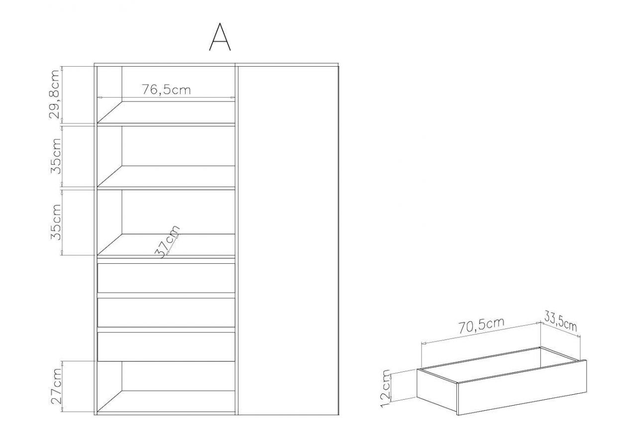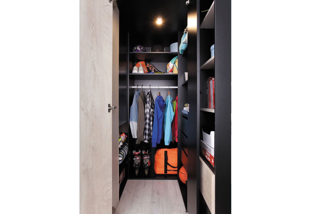 Szafa narożna NALET – pojemna szafa, która sprawdzi się w pokoju młodzieżowym. Dzięki swoim gabarytom pozwoli na zachowanie porządku i ładu w pokoju młodego człowieka. W środku znajduje się duża ilość półek oraz drążek na ubrania. Zewnętrzna część szafy wyposażona została w regał, na którym nastolatek może ustawić pamiątki, ozdoby czy ulubione książki. Dodatkowo można wyposażyć szafę w oświetlenie jednopunktowe z czujnikiem ruchu, które pozwoli na szybkie znalezienie potrzebnego elementu garderoby. Proste i geometryczne kształty brył połączone z ciekawą kolorystyką tworzą idealny duet.