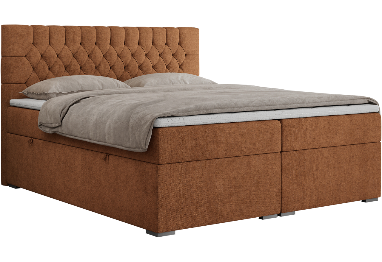 Główny materac kieszeniowy Multipocket dostarcza doskonałego wsparcia dla ciała, dzięki wysokoelastycznej piance T-30 co jest kluczowe dla zdrowego snu. Jego konstrukcja z niezależnymi kieszeniami minimalizuje przenoszenie ruchu. Dodatkowo, materac nawierzchniowy wykończony pianką T-25 zapewnia uczucie miękkości i komfortu, dostosowując się do kształtu ciała. Dwa pojemniki na pościel to praktyczne rozwiązanie, które pozwoli na łatwe przechowywanie pościeli i utrzymanie porządku. Automat na sprężynach sprawia, że otwieranie pojemników jest wygodne i szybkie. Tapicerowany zagłówek to prawdziwa ozdoba, która dodaje wnętrzu klasy i staje się centralnym punktem każdej sypialni.