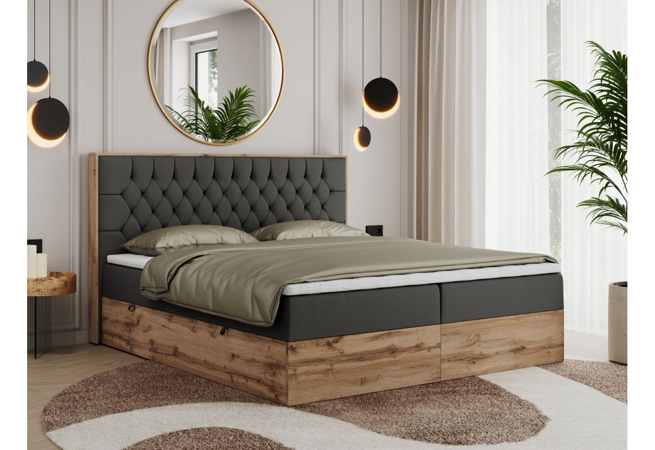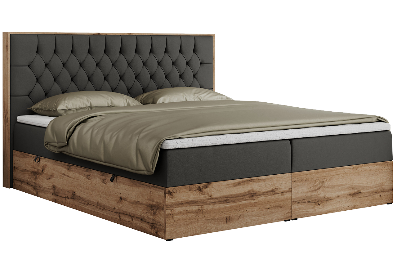 Główny materac kieszeniowy Multipocket dostarcza doskonałego wsparcia dla ciała, dzięki wysokoelastycznej piance T-30 co jest kluczowe dla zdrowego snu. Jego konstrukcja z niezależnymi kieszeniami minimalizuje przenoszenie ruchu. Dodatkowo, materac nawierzchniowy wykończony pianką T-25 zapewnia uczucie miękkości i komfortu, dostosowując się do kształtu ciała. Dwa pojemniki na pościel to praktyczne rozwiązanie, które pozwoli na łatwe przechowywanie pościeli i utrzymanie porządku. Automat na sprężynach sprawia, że otwieranie pojemników jest wygodne i szybkie. Łóżko kontynentalne posiada drewniane wykończenie na skrzyni oraz ramie wezgłowia. Dodaje wnętrzu ciepła i stylu, a nowoczesny design sprawia, że idealnie wpisuje się w różnorodne aranżacje.