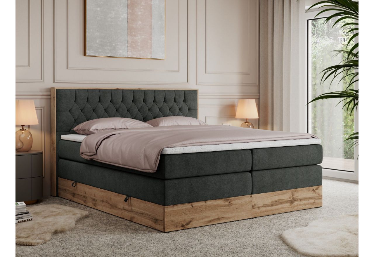 Główny materac kieszeniowy Multipocket dostarcza doskonałego wsparcia dla ciała, dzięki wysokoelastycznej piance T-30 co jest kluczowe dla zdrowego snu. Jego konstrukcja z niezależnymi kieszeniami minimalizuje przenoszenie ruchu. Dodatkowo, materac nawierzchniowy wykończony pianką T-25 zapewnia uczucie miękkości i komfortu, dostosowując się do kształtu ciała. Dwa pojemniki na pościel to praktyczne rozwiązanie, które pozwoli na łatwe przechowywanie pościeli i utrzymanie porządku. Automat na sprężynach sprawia, że otwieranie pojemników jest wygodne i szybkie. Łóżko kontynentalne posiada drewniane wykończenie na skrzyni oraz ramie wezgłowia. Dodaje wnętrzu ciepła i stylu, a nowoczesny design sprawia, że idealnie wpisuje się w różnorodne aranżacje.