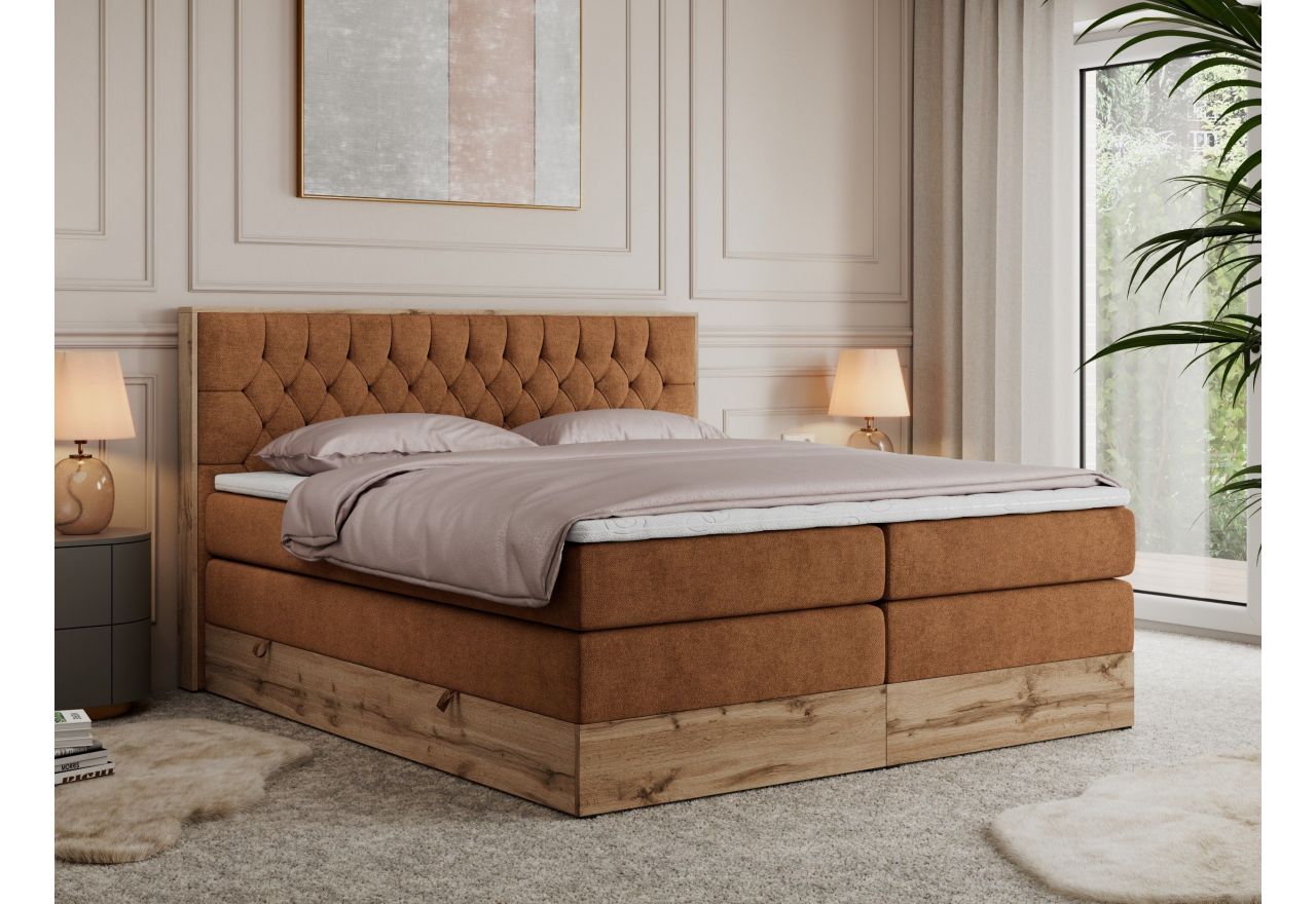 Główny materac kieszeniowy Multipocket dostarcza doskonałego wsparcia dla ciała, dzięki wysokoelastycznej piance T-30 co jest kluczowe dla zdrowego snu. Jego konstrukcja z niezależnymi kieszeniami minimalizuje przenoszenie ruchu. Dodatkowo, materac nawierzchniowy wykończony pianką T-25 zapewnia uczucie miękkości i komfortu, dostosowując się do kształtu ciała. Dwa pojemniki na pościel to praktyczne rozwiązanie, które pozwoli na łatwe przechowywanie pościeli i utrzymanie porządku. Automat na sprężynach sprawia, że otwieranie pojemników jest wygodne i szybkie. Łóżko kontynentalne posiada drewniane wykończenie na skrzyni oraz ramie wezgłowia. Dodaje wnętrzu ciepła i stylu, a nowoczesny design sprawia, że idealnie wpisuje się w różnorodne aranżacje.