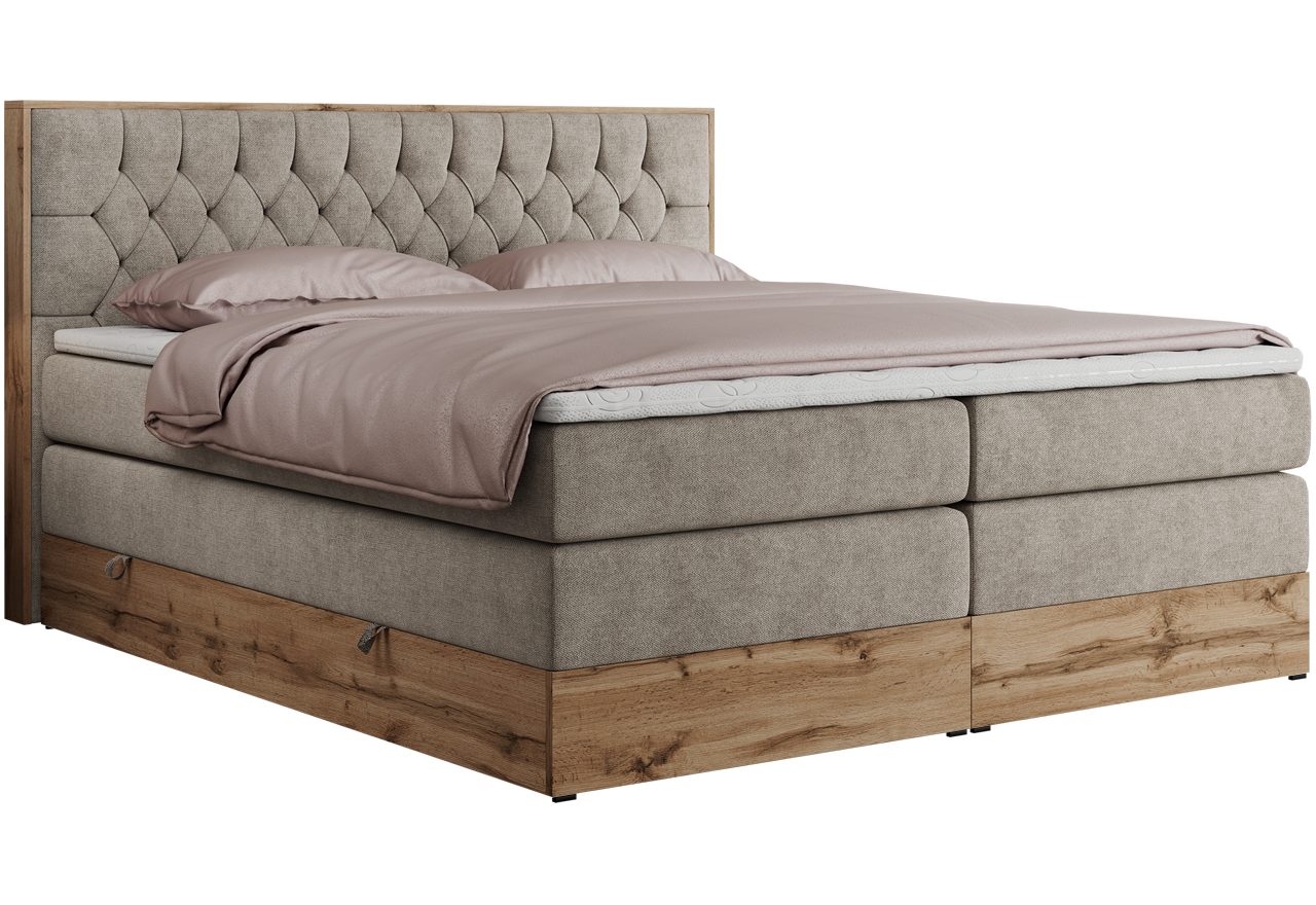 Główny materac kieszeniowy Multipocket dostarcza doskonałego wsparcia dla ciała, dzięki wysokoelastycznej piance T-30 co jest kluczowe dla zdrowego snu. Jego konstrukcja z niezależnymi kieszeniami minimalizuje przenoszenie ruchu. Dodatkowo, materac nawierzchniowy wykończony pianką T-25 zapewnia uczucie miękkości i komfortu, dostosowując się do kształtu ciała. Dwa pojemniki na pościel to praktyczne rozwiązanie, które pozwoli na łatwe przechowywanie pościeli i utrzymanie porządku. Automat na sprężynach sprawia, że otwieranie pojemników jest wygodne i szybkie. Łóżko kontynentalne posiada drewniane wykończenie na skrzyni oraz ramie wezgłowia. Dodaje wnętrzu ciepła i stylu, a nowoczesny design sprawia, że idealnie wpisuje się w różnorodne aranżacje.