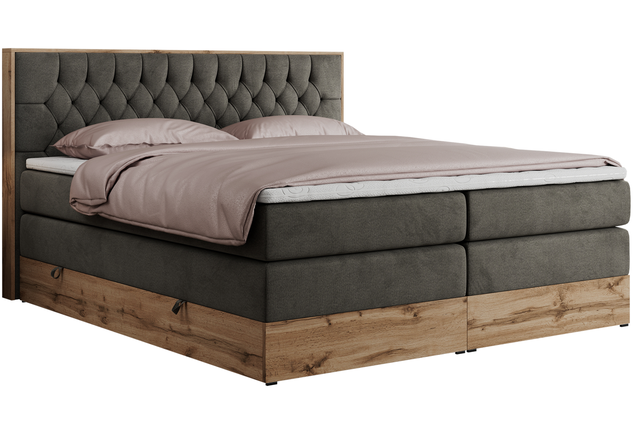 Główny materac kieszeniowy Multipocket dostarcza doskonałego wsparcia dla ciała, dzięki wysokoelastycznej piance T-30 co jest kluczowe dla zdrowego snu. Jego konstrukcja z niezależnymi kieszeniami minimalizuje przenoszenie ruchu. Dodatkowo, materac nawierzchniowy wykończony pianką T-25 zapewnia uczucie miękkości i komfortu, dostosowując się do kształtu ciała. Dwa pojemniki na pościel to praktyczne rozwiązanie, które pozwoli na łatwe przechowywanie pościeli i utrzymanie porządku. Automat na sprężynach sprawia, że otwieranie pojemników jest wygodne i szybkie. Łóżko kontynentalne posiada drewniane wykończenie na skrzyni oraz ramie wezgłowia. Dodaje wnętrzu ciepła i stylu, a nowoczesny design sprawia, że idealnie wpisuje się w różnorodne aranżacje.