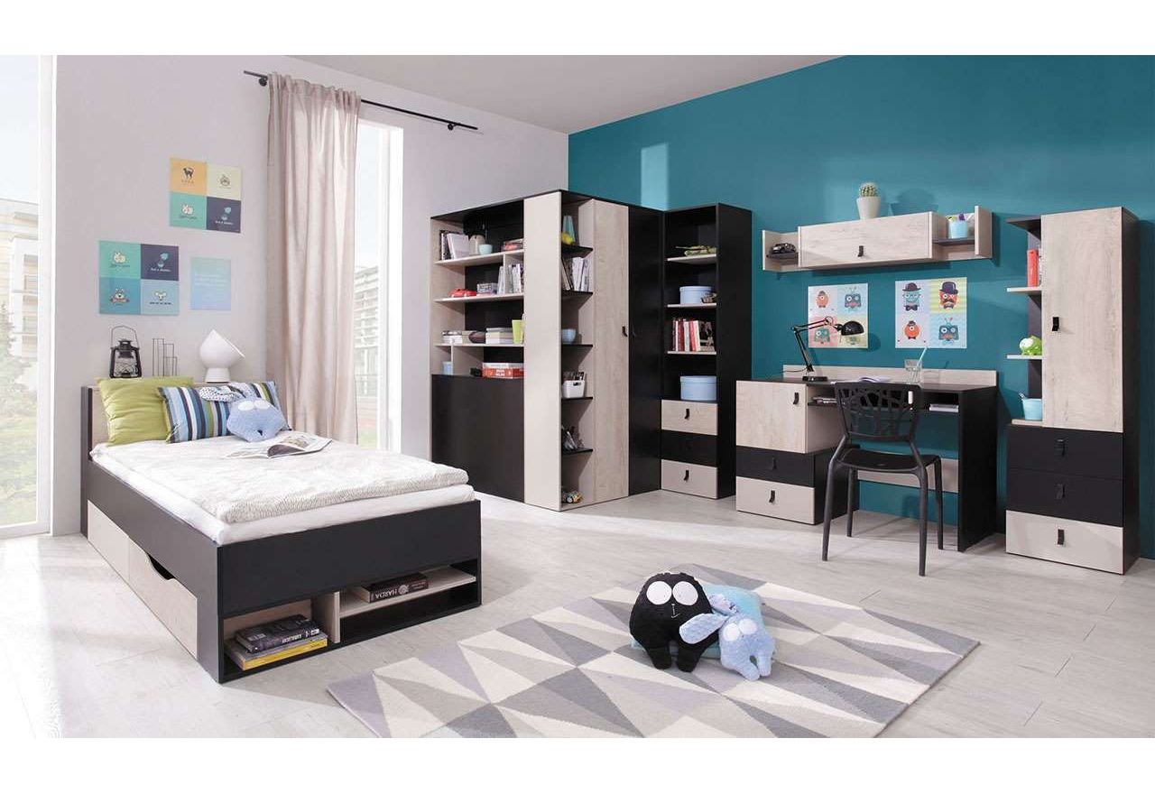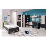 Meble systemowe z kolekcji NALET – dedykowane są do pokoju młodzieżowego. Bryły wyróżniają się wysoką jakością wykonania oraz atrakcyjnym wyglądem. Swoim wyglądem przyciągają spojrzenia, przez co nie przejdziesz obok nich obojętnie. Zestaw składa się z szaf, regałów, biurka, łóżka 90x200 cm, komody, szafki RTV oraz półek, które można dowolnie ze sobą łączyć według uznania. W szafie narożnej dostępne jest oświetlenie jednopunktowe z czujnikiem ruchu w opcji. Łóżko można wyposażyć w materac. Płyta meblowa użyta podczas produkcji jest bardzo wysokiej jakości, a obrzeża zostały dodatkowo wykończone okleiną ABS. Szuflady posiadają prowadnice rolkowe. Uchwyty wykonane zostały z tworzywa sztucznego. Materiały jak i solidne wykonanie dają gwarancję na użytkowanie przez długie lata. Stwórz wymarzony pokój nastolatka z kolekcją mebli NALET!