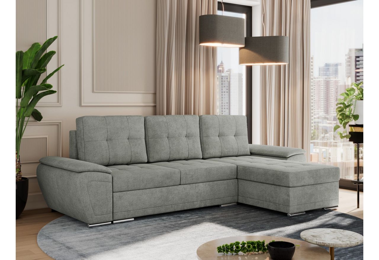 Wyjątkowy komfort użytkowania zapewniają wysokiej jakości pianka poliuretanowa oraz sprężyny faliste, które gwarantują miękkość i stabilność nawet przy intensywnym użytkowaniu. Dodatkowo praktyczny pojemnik na pościel ułatwia przechowywanie koców, poduszek czy innych niezbędnych rzeczy, pomagając utrzymać porządek w salonie. Narożnik posiada funkcję spania z mechanizmem DL, co umożliwia szybkie i łatwe przekształcenie.