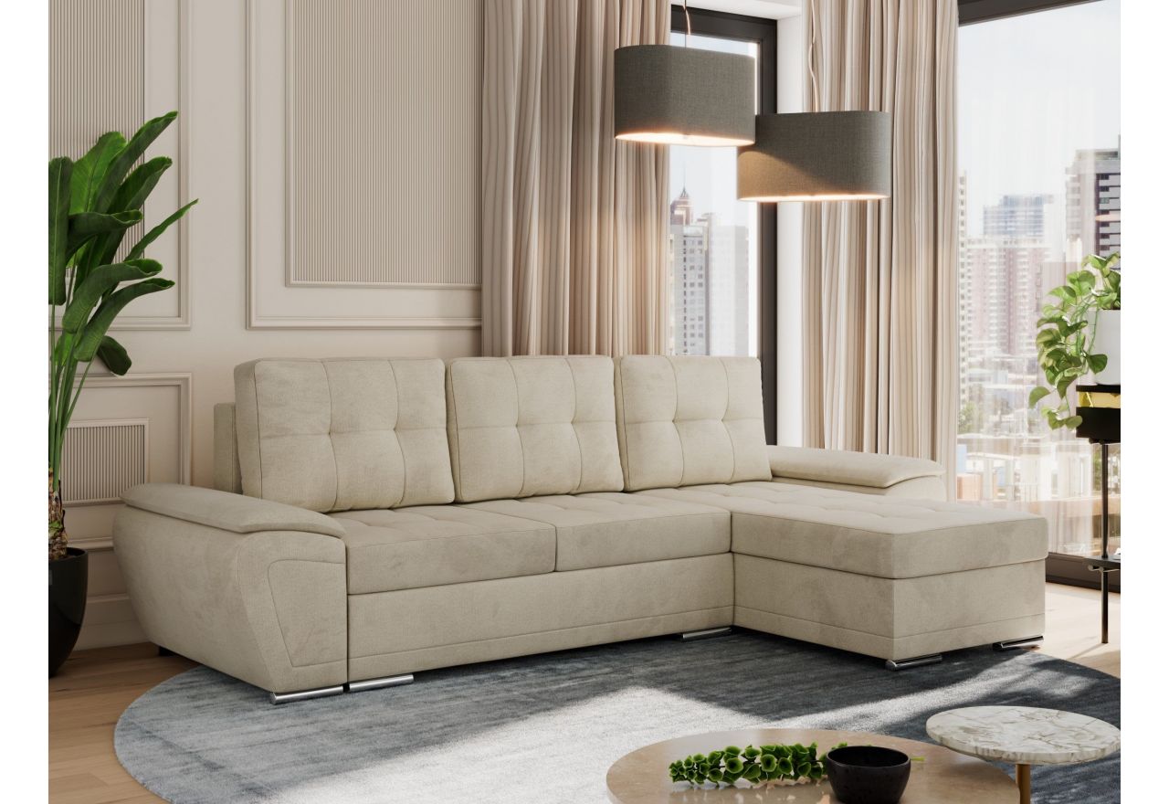 Wyjątkowy komfort użytkowania zapewniają wysokiej jakości pianka poliuretanowa oraz sprężyny faliste, które gwarantują miękkość i stabilność nawet przy intensywnym użytkowaniu. Dodatkowo praktyczny pojemnik na pościel ułatwia przechowywanie koców, poduszek czy innych niezbędnych rzeczy, pomagając utrzymać porządek w salonie. Narożnik posiada funkcję spania z mechanizmem DL, co umożliwia szybkie i łatwe przekształcenie.