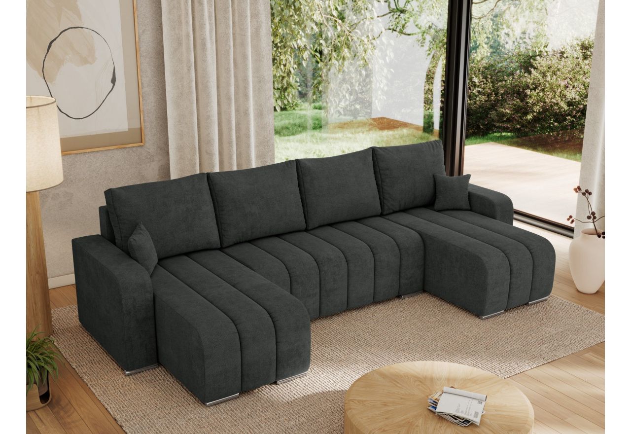 KIRASSO U wyróżnia się także funkcjonalnością. Dzięki mechanizmowi DL, rozłożenie narożnika do spania jest intuicyjne i wygodne, a powierzchnia o wymiarach 130x275 cm zapewnia komfortowy sen. Dodatkowym atutem jest pojemnik na pościel, który pozwala na przechowywanie poduszek, koców i innych tekstyliów w łatwy sposób.
