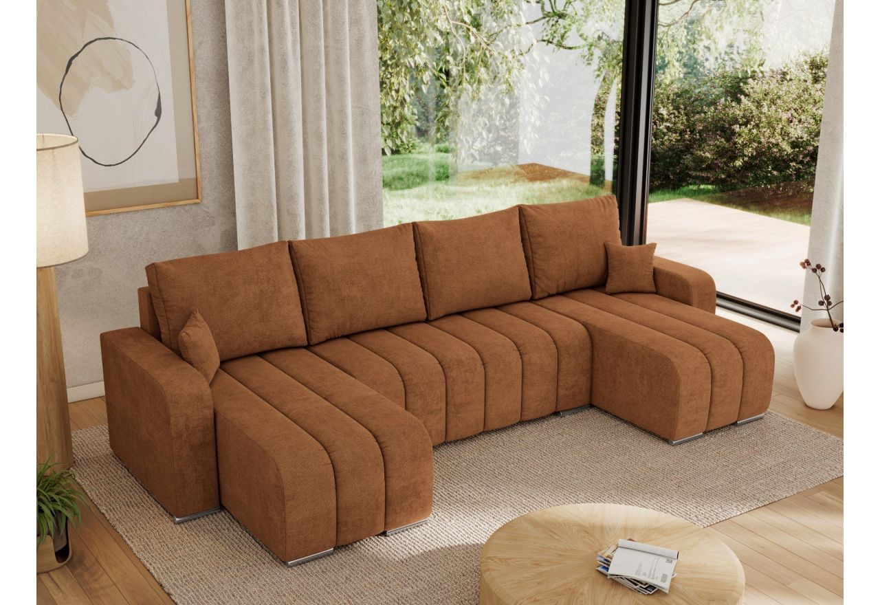 Wyjątkowy komfort użytkowania zapewniają pianka T30 oraz sprężyny Bonell, które gwarantują optymalne podparcie podczas siedzenia i spania. Obszerne poduszki oparciowe i dekoracyjne, pionowe przeszycia na siedzisku podkreślają estetykę narożnika, czyniąc go centralnym punktem każdego salonu.