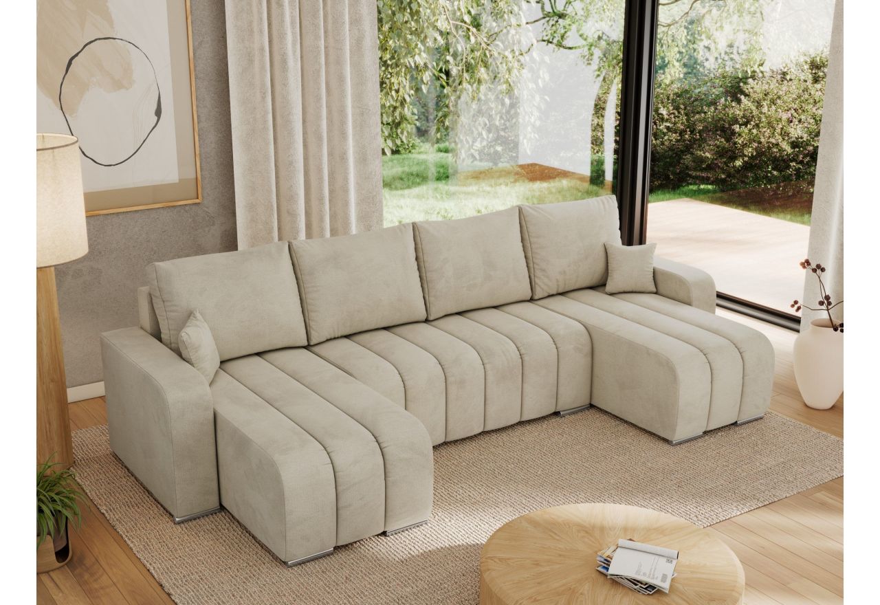 KIRASSO U wyróżnia się także funkcjonalnością. Dzięki mechanizmowi DL, rozłożenie narożnika do spania jest intuicyjne i wygodne, a powierzchnia o wymiarach 130x275 cm zapewnia komfortowy sen. Dodatkowym atutem jest pojemnik na pościel, który pozwala na przechowywanie poduszek, koców i innych tekstyliów w łatwy sposób.