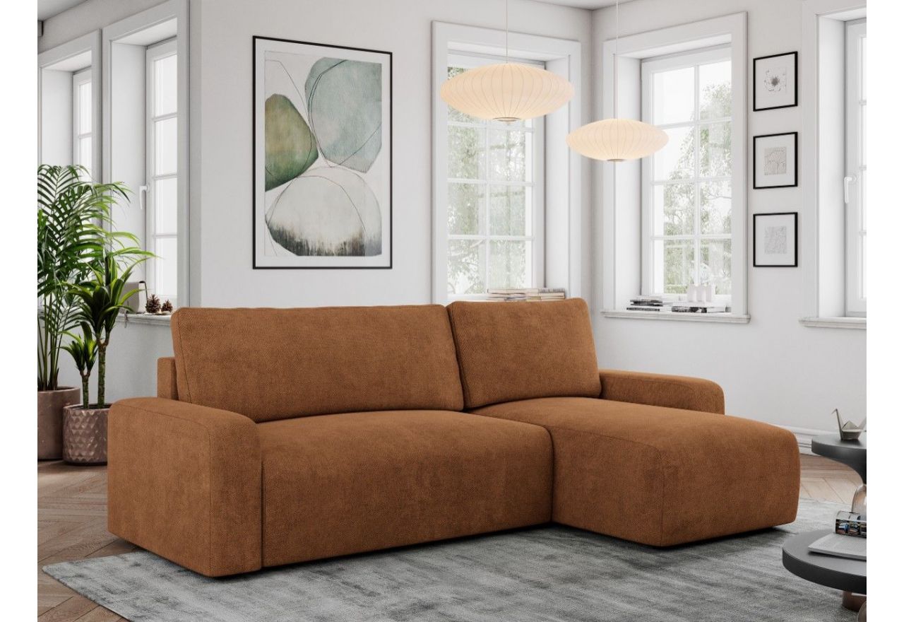 Narożnik opiera się na solidnej ramie, gwarantującym trwałość i odpowiednią wytrzymałość. Konstrukcja narożnika składa się z wysokiej jakości sprężyn falistych oraz trwałej pianki wysokoelastycznej, co zapewnia komfort użytkowania oraz odpowiednie podparcie. Narożnik posiada funkcję spania, umożliwiając szybkie i wygodne przekształcenie go w łóżko. Automat z mechanizmem DL umożliwia szybkie i wygodne rozłożenie narożnika, czyniąc go doskonałym rozwiązaniem do codziennego użytkowania oraz dla gości. Podnośnik sprężynowy umożliwia rozkładanie mebla bez potrzeby przesuwania go po podłodze, a tym samym bez rysowania podłogi. Dodatkowym atutem jest praktyczny pojemnik na pościel, który pomaga w utrzymaniu porządku i optymalnym wykorzystaniu przestrzeni. Dzięki swojej funkcjonalności i estetycznemu designowi, stanowi harmonijne połączenie komfortu i praktyczności. Narożnik to nie tylko praktyczny i wygodny mebel do mieszkania. Dzięki nowoczesnemu, eleganckiemu stylowi jest także prawdziwą ozdobą każdego salonu.