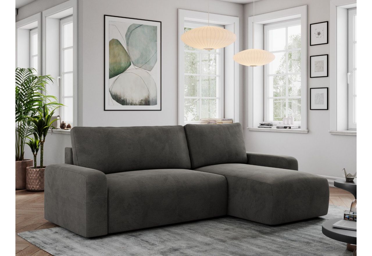 Narożnik opiera się na solidnej ramie, gwarantującym trwałość i odpowiednią wytrzymałość. Konstrukcja narożnika składa się z wysokiej jakości sprężyn falistych oraz trwałej pianki wysokoelastycznej, co zapewnia komfort użytkowania oraz odpowiednie podparcie. Narożnik posiada funkcję spania, umożliwiając szybkie i wygodne przekształcenie go w łóżko. Automat z mechanizmem DL umożliwia szybkie i wygodne rozłożenie narożnika, czyniąc go doskonałym rozwiązaniem do codziennego użytkowania oraz dla gości. Podnośnik sprężynowy umożliwia rozkładanie mebla bez potrzeby przesuwania go po podłodze, a tym samym bez rysowania podłogi. Dodatkowym atutem jest praktyczny pojemnik na pościel, który pomaga w utrzymaniu porządku i optymalnym wykorzystaniu przestrzeni. Dzięki swojej funkcjonalności i estetycznemu designowi, stanowi harmonijne połączenie komfortu i praktyczności. Narożnik to nie tylko praktyczny i wygodny mebel do mieszkania. Dzięki nowoczesnemu, eleganckiemu stylowi jest także prawdziwą ozdobą każdego salonu.