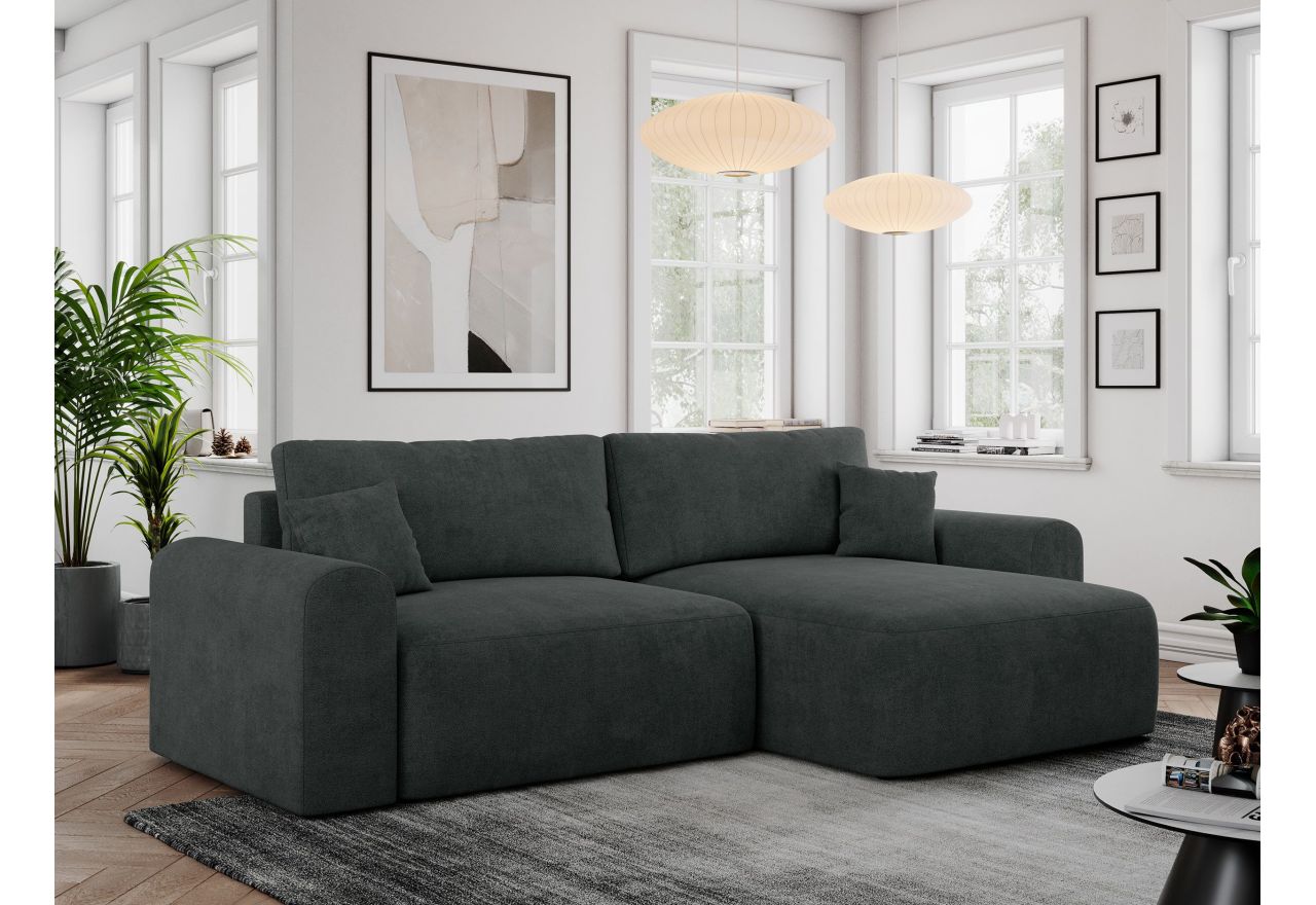 Narożnik opiera się na solidnej ramie, która gwarantuje trwałość i odpowiednią wytrzymałość. Konstrukcja narożnika składa się z wysokiej jakości sprężyn falistych oraz trwałej pianki wysokoelastycznej, co zapewnia komfort użytkowania oraz odpowiednie podparcie. Narożnik posiada funkcję spania, umożliwiając szybkie i wygodne przekształcenie go w łóżko. Automat z mechanizmem DL umożliwia szybkie i wygodne rozłożenie narożnika, czyniąc go doskonałym rozwiązaniem do codziennego użytkowania oraz dla gości. Podnośnik sprężynowy ułatwia rozkładanie mebla, bez potrzeby przesuwania go po podłodze, a tym samym bez rysowania podłogi. Dodatkowym atutem jest praktyczny pojemnik na pościel, który pomaga w utrzymaniu porządku i optymalnym wykorzystaniu przestrzeni. Dzięki swojej funkcjonalności i estetycznemu designowi, stanowi harmonijne połączenie komfortu i praktyczności. Narożnik to nie tylko praktyczny i wygodny mebel do mieszkania. Dzięki nowoczesnemu, eleganckiemu stylowi jest także prawdziwą ozdobą każdego salonu.