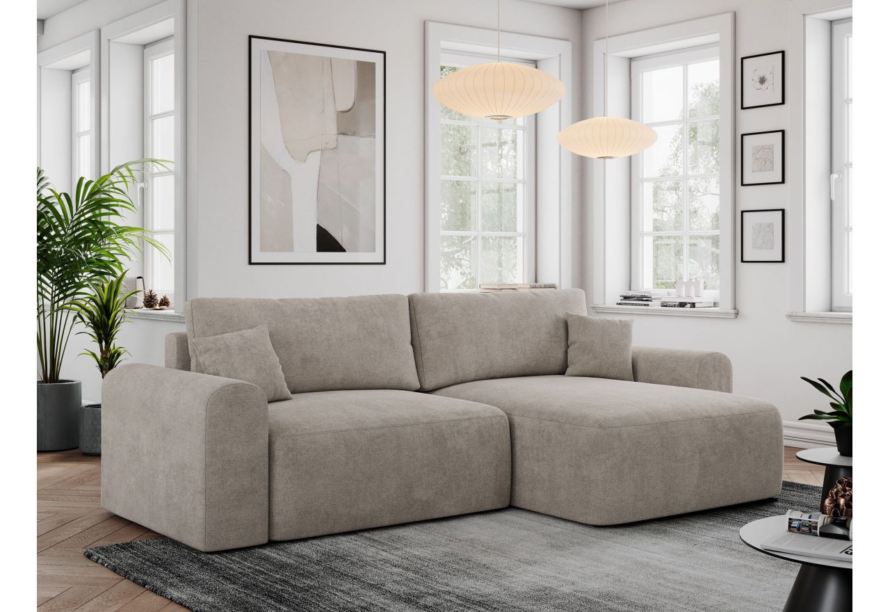 Narożnik opiera się na solidnej ramie, która gwarantuje trwałość i odpowiednią wytrzymałość. Konstrukcja narożnika składa się z wysokiej jakości sprężyn falistych oraz trwałej pianki wysokoelastycznej, co zapewnia komfort użytkowania oraz odpowiednie podparcie. Narożnik posiada funkcję spania, umożliwiając szybkie i wygodne przekształcenie go w łóżko. Automat z mechanizmem DL umożliwia szybkie i wygodne rozłożenie narożnika, czyniąc go doskonałym rozwiązaniem do codziennego użytkowania oraz dla gości. Podnośnik sprężynowy ułatwia rozkładanie mebla, bez potrzeby przesuwania go po podłodze, a tym samym bez rysowania podłogi. Dodatkowym atutem jest praktyczny pojemnik na pościel, który pomaga w utrzymaniu porządku i optymalnym wykorzystaniu przestrzeni. Dzięki swojej funkcjonalności i estetycznemu designowi, stanowi harmonijne połączenie komfortu i praktyczności. Narożnik to nie tylko praktyczny i wygodny mebel do mieszkania. Dzięki nowoczesnemu, eleganckiemu stylowi jest także prawdziwą ozdobą każdego salonu.