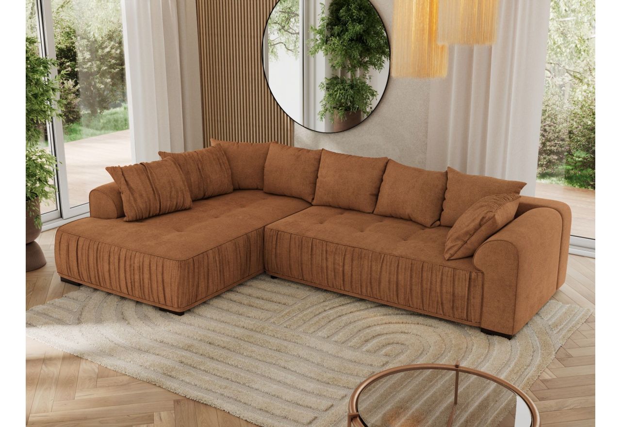 Konstrukcja narożnika składa się z wysokiej jakości sprężyn falistych oraz trwałej pianki wysokoelastycznej, co zapewnia komfort użytkowania oraz odpowiednie podparcie. Narożnik posiada funkcję spania, umożliwiając szybkie i wygodne przekształcenie go w łóżko. Automat z mechanizmem DL umożliwia szybkie i wygodne rozłożenie narożnika, czyniąc go doskonałym rozwiązaniem do codziennego użytkowania oraz dla gości. Podnośnik sprężynowy umożliwia rozkładanie mebla bez potrzeby przesuwania go po podłodze, a tym samym bez rysowania podłogi. Dodatkowym atutem jest praktyczny pojemnik na pościel, który pomaga w utrzymaniu porządku i optymalnym wykorzystaniu przestrzeni. Ozdobne drapowanie na siedzisku dodaje stylowych akcentów i nadaje narożnikowi niepowtarzalnego uroku. Dzięki swojej funkcjonalności i estetycznemu designowi, stanowi harmonijne połączenie komfortu i praktyczności. Narożnik to nie tylko praktyczny i wygodny mebel do mieszkania. Dzięki nowoczesnemu, eleganckiemu stylowi jest także prawdziwą ozdobą każdego salonu.