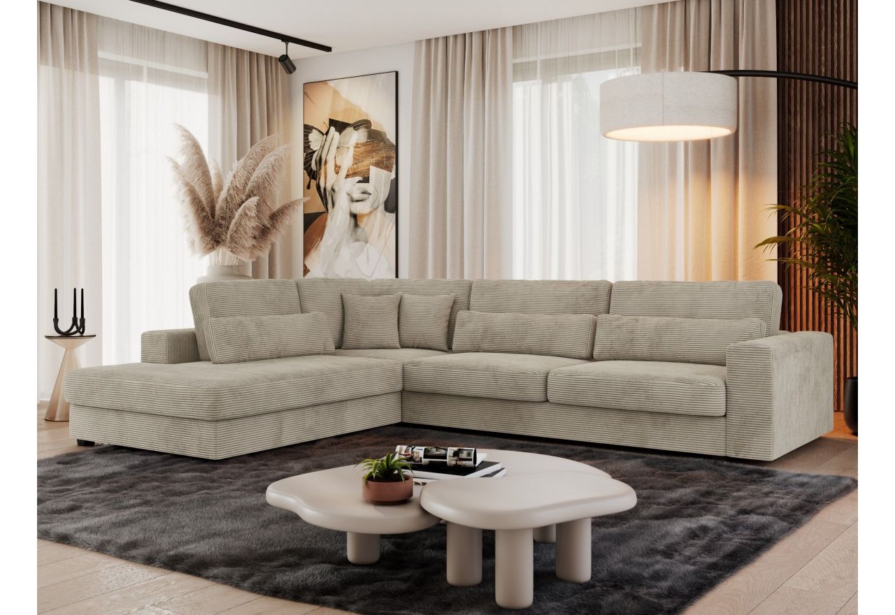 Konstrukcja narożnika składa się z wysokiej jakości sprężyn falistych oraz trwałej pianki wysokoelastycznej, co zapewnia komfort użytkowania oraz odpowiednie podparcie. Sofa posiada solidne nóżki z tworzywa sztucznego i ozdobne poduszki. Choć nie posiada funkcji spania, zachwyca nowoczesnym designem i wysokim poziomem komfortu. Narożnik idealny do dużych pomieszczeń, charakteryzuje się przestronnością i imponującą szerokością, dzięki czemu zapewni komfortowy nocleg wielu osobom. Dzięki swojej funkcjonalności i estetycznemu designowi, stanowi harmonijne połączenie komfortu i praktyczności. Narożnik to nie tylko praktyczny i wygodny mebel do mieszkania. Dzięki nowoczesnemu, eleganckiemu stylowi jest także prawdziwą ozdobą każdego salonu.