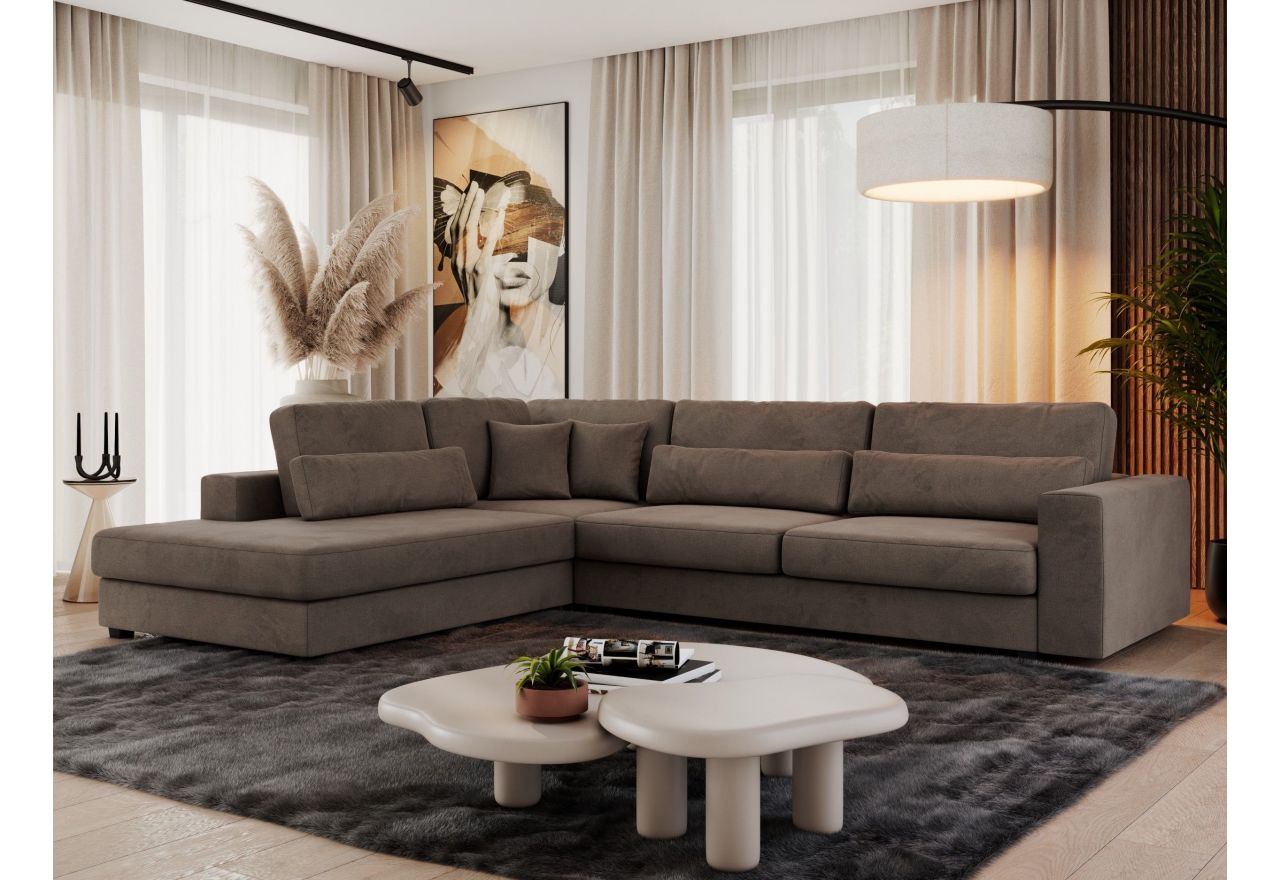 Konstrukcja narożnika składa się z wysokiej jakości sprężyn falistych oraz trwałej pianki wysokoelastycznej, co zapewnia komfort użytkowania oraz odpowiednie podparcie. Sofa posiada solidne nóżki z tworzywa sztucznego i ozdobne poduszki. Choć nie posiada funkcji spania, zachwyca nowoczesnym designem i wysokim poziomem komfortu. Narożnik idealny do dużych pomieszczeń, charakteryzuje się przestronnością i imponującą szerokością, dzięki czemu zapewni komfortowy nocleg wielu osobom. Dzięki swojej funkcjonalności i estetycznemu designowi, stanowi harmonijne połączenie komfortu i praktyczności. Narożnik to nie tylko praktyczny i wygodny mebel do mieszkania. Dzięki nowoczesnemu, eleganckiemu stylowi jest także prawdziwą ozdobą każdego salonu.