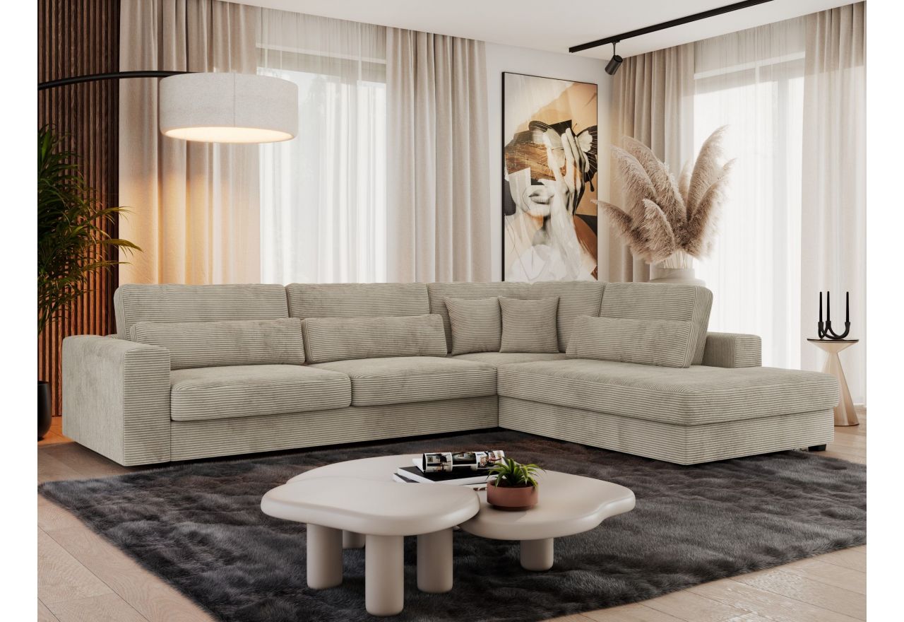 Konstrukcja narożnika składa się z wysokiej jakości sprężyn falistych oraz trwałej pianki wysokoelastycznej, co zapewnia komfort użytkowania oraz odpowiednie podparcie. Sofa posiada solidne nóżki z tworzywa sztucznego i ozdobne poduszki. Choć nie posiada funkcji spania, zachwyca nowoczesnym designem i wysokim poziomem komfortu. Narożnik idealny do dużych pomieszczeń, charakteryzuje się przestronnością i imponującą szerokością, dzięki czemu zapewni komfortowy nocleg wielu osobom. Dzięki swojej funkcjonalności i estetycznemu designowi, stanowi harmonijne połączenie komfortu i praktyczności. Narożnik to nie tylko praktyczny i wygodny mebel do mieszkania. Dzięki nowoczesnemu, eleganckiemu stylowi jest także prawdziwą ozdobą każdego salonu.