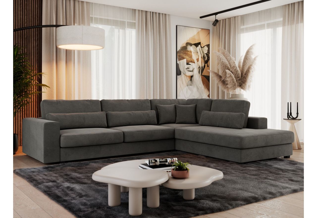 Konstrukcja narożnika składa się z wysokiej jakości sprężyn falistych oraz trwałej pianki wysokoelastycznej, co zapewnia komfort użytkowania oraz odpowiednie podparcie. Sofa posiada solidne nóżki z tworzywa sztucznego i ozdobne poduszki. Choć nie posiada funkcji spania, zachwyca nowoczesnym designem i wysokim poziomem komfortu. Narożnik idealny do dużych pomieszczeń, charakteryzuje się przestronnością i imponującą szerokością, dzięki czemu zapewni komfortowy nocleg wielu osobom. Dzięki swojej funkcjonalności i estetycznemu designowi, stanowi harmonijne połączenie komfortu i praktyczności. Narożnik to nie tylko praktyczny i wygodny mebel do mieszkania. Dzięki nowoczesnemu, eleganckiemu stylowi jest także prawdziwą ozdobą każdego salonu.