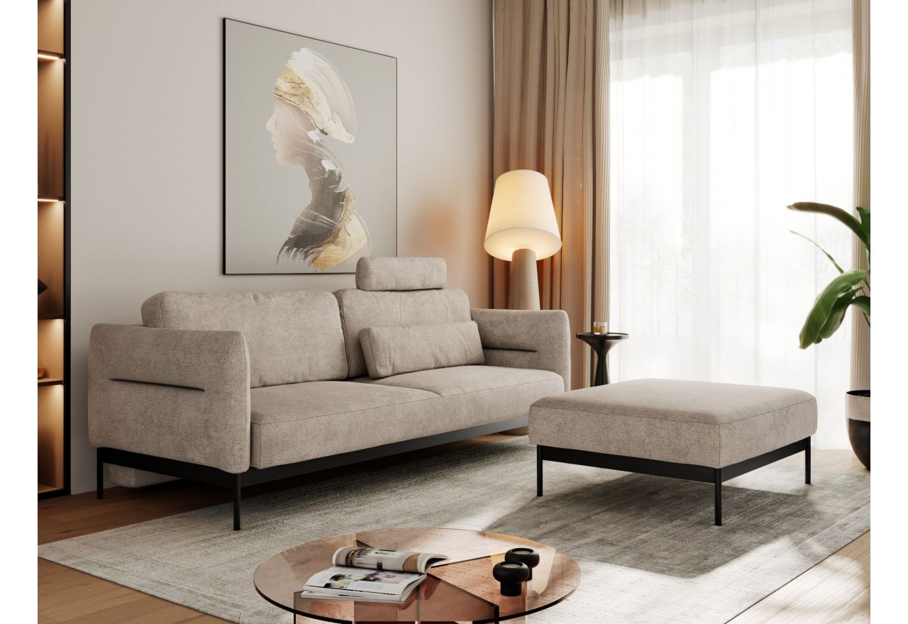 Sofa z podnóżkiem opiera się na solidnej, metalowej ramie, gwarantującym trwałość i odpowiednią wytrzymałość. Konstrukcja składa się z wysokiej jakości sprężyn kieszeniowych oraz trwałej pianki wysokoelastycznej, co zapewnia komfort użytkowania oraz odpowiednie podparcie. Sofa z podnóżkiem posiada funkcję spania, umożliwiając szybkie i wygodne przekształcenie go w łóżko. Automat z mechanizmem DL umożliwia szybkie i wygodne rozłożenie, czyniąc go doskonałym rozwiązaniem do codziennego użytkowania oraz dla gości. Podnośnik sprężynowy umożliwia rozkładanie mebla bez potrzeby przesuwania go po podłodze, a tym samym bez rysowania podłogi. Mebel posiada w zestawie mobilny, ruchomy zagłówek, który możesz przenieść, w zależności po której stronie sofy siedzisz. Kanapa posiada również odłączany puf, który pozwala na wszechstronność i indywidualną aranżację. Można go dopasować do każdej koncepcji pomieszczenia. Elementy sofy można używać oddzielnie, dostosowując się do potrzeb każdego salonu. Sofa z podnóżkiem to nie tylko praktyczny i wygodny mebel do mieszkania. Pasuje idealnie do stylów skandynawskich, industrialnych oraz loft.
