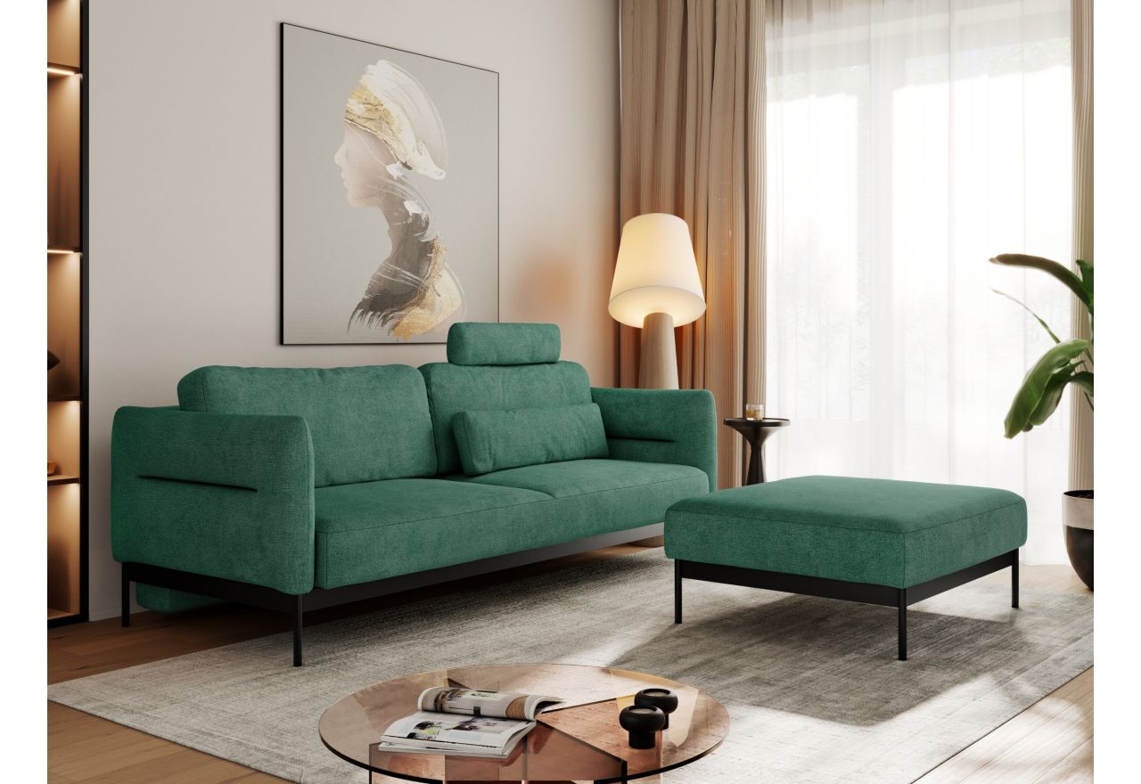 Sofa z podnóżkiem opiera się na solidnej, metalowej ramie, gwarantującym trwałość i odpowiednią wytrzymałość. Konstrukcja składa się z wysokiej jakości sprężyn kieszeniowych oraz trwałej pianki wysokoelastycznej, co zapewnia komfort użytkowania oraz odpowiednie podparcie. Sofa z podnóżkiem posiada funkcję spania, umożliwiając szybkie i wygodne przekształcenie go w łóżko. Automat z mechanizmem DL umożliwia szybkie i wygodne rozłożenie, czyniąc go doskonałym rozwiązaniem do codziennego użytkowania oraz dla gości. Podnośnik sprężynowy umożliwia rozkładanie mebla bez potrzeby przesuwania go po podłodze, a tym samym bez rysowania podłogi. Mebel posiada w zestawie mobilny, ruchomy zagłówek, który możesz przenieść, w zależności po której stronie sofy siedzisz. Kanapa posiada również odłączany puf, który pozwala na wszechstronność i indywidualną aranżację. Można go dopasować do każdej koncepcji pomieszczenia. Elementy sofy można używać oddzielnie, dostosowując się do potrzeb każdego salonu. Sofa z podnóżkiem to nie tylko praktyczny i wygodny mebel do mieszkania. Pasuje idealnie do stylów skandynawskich, industrialnych oraz loft.