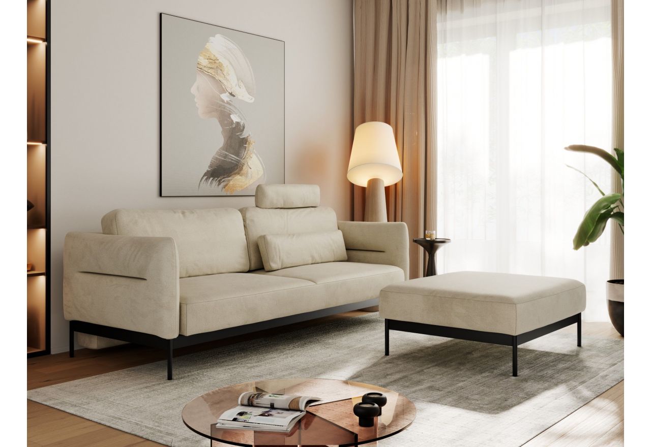Sofa z podnóżkiem opiera się na solidnej, metalowej ramie, gwarantującym trwałość i odpowiednią wytrzymałość. Konstrukcja składa się z wysokiej jakości sprężyn kieszeniowych oraz trwałej pianki wysokoelastycznej, co zapewnia komfort użytkowania oraz odpowiednie podparcie. Sofa z podnóżkiem posiada funkcję spania, umożliwiając szybkie i wygodne przekształcenie go w łóżko. Automat z mechanizmem DL umożliwia szybkie i wygodne rozłożenie, czyniąc go doskonałym rozwiązaniem do codziennego użytkowania oraz dla gości. Podnośnik sprężynowy umożliwia rozkładanie mebla bez potrzeby przesuwania go po podłodze, a tym samym bez rysowania podłogi. Mebel posiada w zestawie mobilny, ruchomy zagłówek, który możesz przenieść, w zależności po której stronie sofy siedzisz. Kanapa posiada również odłączany puf, który pozwala na wszechstronność i indywidualną aranżację. Można go dopasować do każdej koncepcji pomieszczenia. Elementy sofy można używać oddzielnie, dostosowując się do potrzeb każdego salonu. Sofa z podnóżkiem to nie tylko praktyczny i wygodny mebel do mieszkania. Pasuje idealnie do stylów skandynawskich, industrialnych oraz loft.