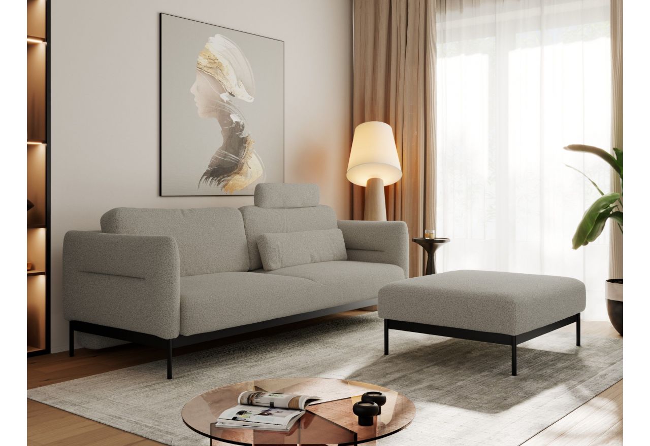 Sofa z podnóżkiem opiera się na solidnej, metalowej ramie, gwarantującym trwałość i odpowiednią wytrzymałość. Konstrukcja składa się z wysokiej jakości sprężyn kieszeniowych oraz trwałej pianki wysokoelastycznej, co zapewnia komfort użytkowania oraz odpowiednie podparcie. Sofa z podnóżkiem posiada funkcję spania, umożliwiając szybkie i wygodne przekształcenie go w łóżko. Automat z mechanizmem DL umożliwia szybkie i wygodne rozłożenie, czyniąc go doskonałym rozwiązaniem do codziennego użytkowania oraz dla gości. Podnośnik sprężynowy umożliwia rozkładanie mebla bez potrzeby przesuwania go po podłodze, a tym samym bez rysowania podłogi. Mebel posiada w zestawie mobilny, ruchomy zagłówek, który możesz przenieść, w zależności po której stronie sofy siedzisz. Kanapa posiada również odłączany puf, który pozwala na wszechstronność i indywidualną aranżację. Można go dopasować do każdej koncepcji pomieszczenia. Elementy sofy można używać oddzielnie, dostosowując się do potrzeb każdego salonu. Sofa z podnóżkiem to nie tylko praktyczny i wygodny mebel do mieszkania. Pasuje idealnie do stylów skandynawskich, industrialnych oraz loft.