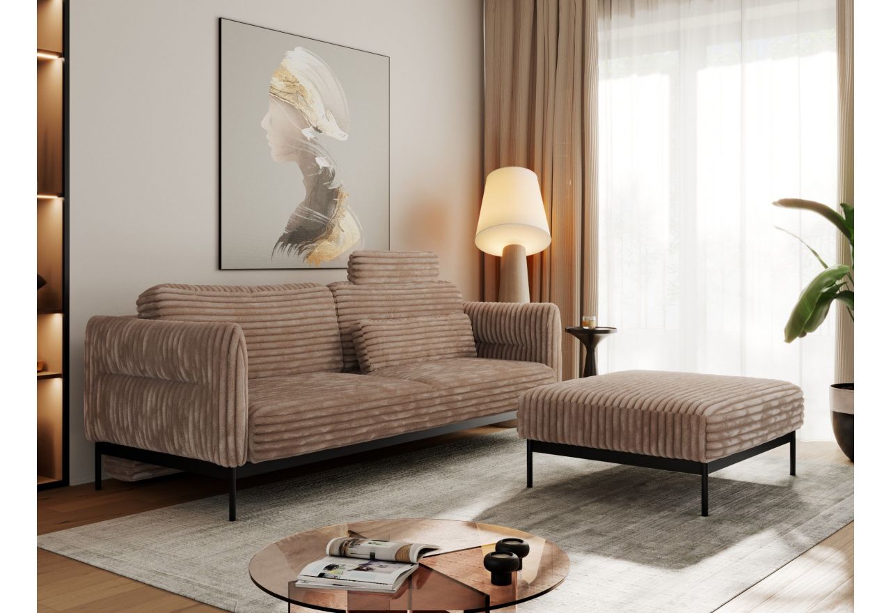 Sofa z podnóżkiem opiera się na solidnej, metalowej ramie, gwarantującym trwałość i odpowiednią wytrzymałość. Konstrukcja składa się z wysokiej jakości sprężyn kieszeniowych oraz trwałej pianki wysokoelastycznej, co zapewnia komfort użytkowania oraz odpowiednie podparcie. Sofa z podnóżkiem posiada funkcję spania, umożliwiając szybkie i wygodne przekształcenie go w łóżko. Automat z mechanizmem DL umożliwia szybkie i wygodne rozłożenie, czyniąc go doskonałym rozwiązaniem do codziennego użytkowania oraz dla gości. Podnośnik sprężynowy umożliwia rozkładanie mebla bez potrzeby przesuwania go po podłodze, a tym samym bez rysowania podłogi. Mebel posiada w zestawie mobilny, ruchomy zagłówek, który możesz przenieść, w zależności po której stronie sofy siedzisz. Kanapa posiada również odłączany puf, który pozwala na wszechstronność i indywidualną aranżację. Można go dopasować do każdej koncepcji pomieszczenia. Elementy sofy można używać oddzielnie, dostosowując się do potrzeb każdego salonu. Sofa z podnóżkiem to nie tylko praktyczny i wygodny mebel do mieszkania. Pasuje idealnie do stylów skandynawskich, industrialnych oraz loft.