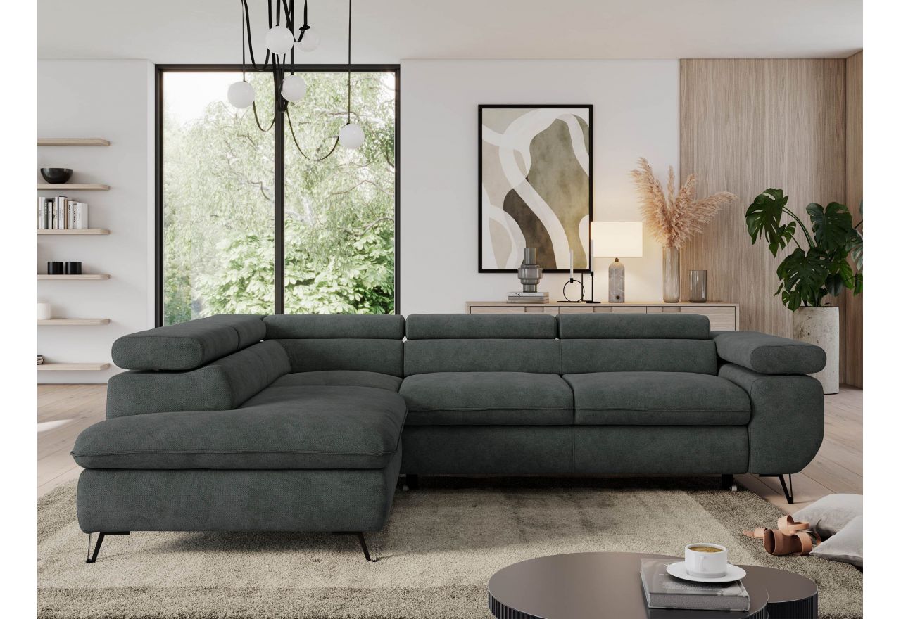 Narożnik PEDRO L to mebel, który łączy nowoczesny design z funkcjonalnością, tworząc elegancki punkt centralny w każdym salonie. Jego forma w kształcie litery L sprawia, że idealnie pasuje do przestronnych wnętrz, zapewniając wygodne miejsce do odpoczynku dla rodziny oraz gości. Narożnik wykonany jest w wysokiej jakości materiałach, z czarnymi metalowymi nóżkami, które nie tylko dodają nowoczesnego charakteru, ale również ułatwiają utrzymanie czystości w pomieszczeniu. Podczas zakupu należy wybrać stronę narożnika – lewą lub prawą.