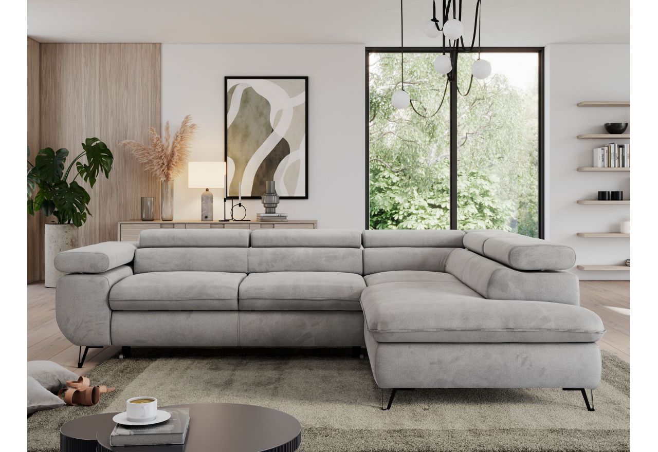 Narożnik PEDRO L to mebel, który łączy nowoczesny design z funkcjonalnością, tworząc elegancki punkt centralny w każdym salonie. Jego forma w kształcie litery L sprawia, że idealnie pasuje do przestronnych wnętrz, zapewniając wygodne miejsce do odpoczynku dla rodziny oraz gości. Narożnik wykonany jest w wysokiej jakości materiałach, z czarnymi metalowymi nóżkami, które nie tylko dodają nowoczesnego charakteru, ale również ułatwiają utrzymanie czystości w pomieszczeniu. Podczas zakupu należy wybrać stronę narożnika – lewą lub prawą.