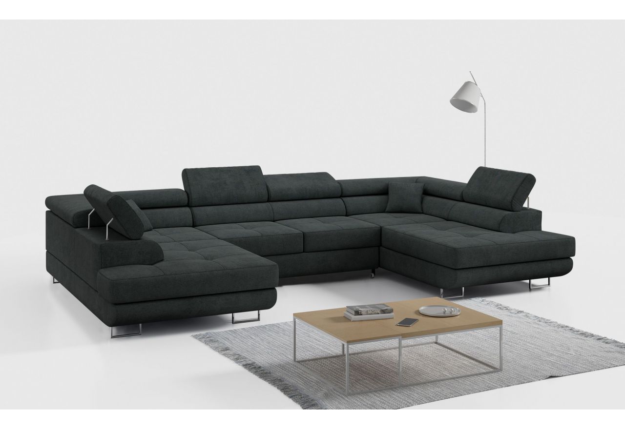 Konstrukcja narożnika opiera się na wysokiej jakości sprężynach oraz trwałej piance wysokoelastycznej T30, co zapewnia komfort użytkowania oraz odpowiednie podparcie. Narożnik posiada funkcję spania, umożliwiając szybkie i wygodne przekształcenie go w łóżko, co czyni go idealnym rozwiązaniem dla gości lub codziennego użytku. Dodatkowym atutem są praktyczne pojemniki na pościel, które pomagają w utrzymaniu porządku i optymalnym wykorzystaniu przestrzeni. Automat na sprężynach sprawia, że otwieranie pojemników jest wygodne i szybkie. Dzięki swojej funkcjonalności i estetycznemu designowi, stanowi harmonijne połączenie komfortu i praktyczności.