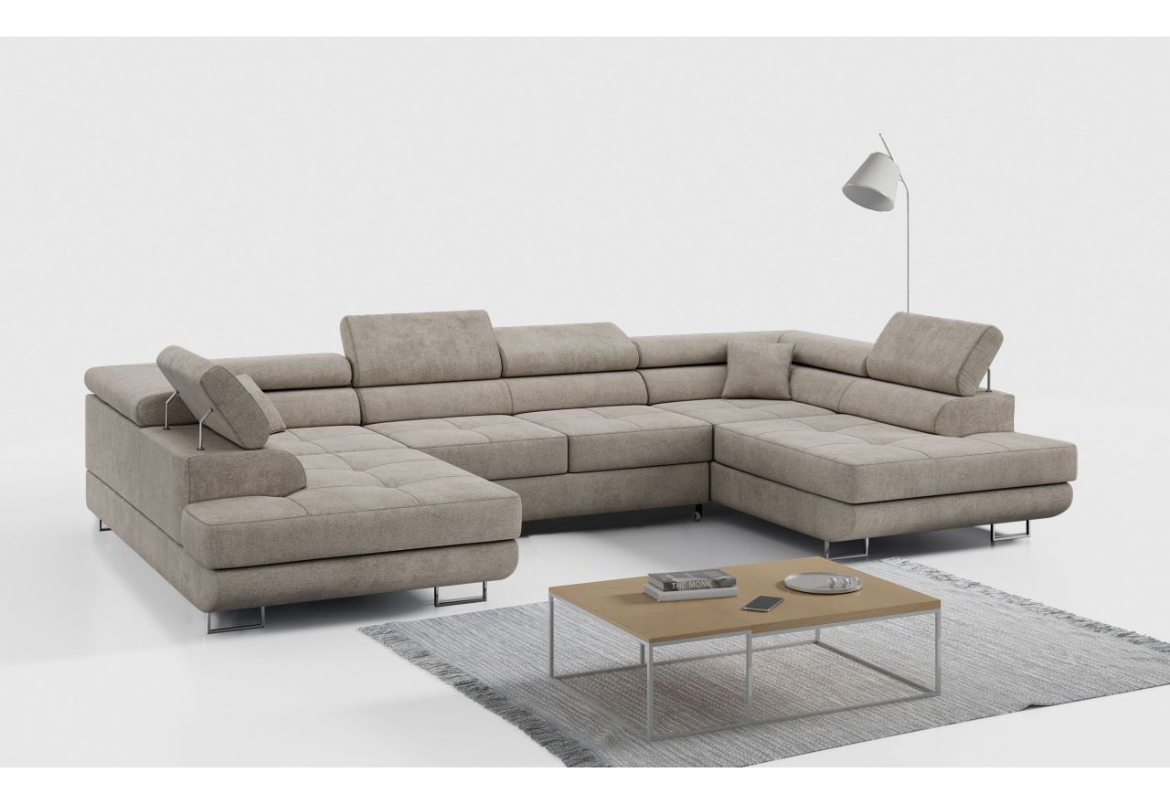 Konstrukcja narożnika opiera się na wysokiej jakości sprężynach oraz trwałej piance wysokoelastycznej T30, co zapewnia komfort użytkowania oraz odpowiednie podparcie. Narożnik posiada funkcję spania, umożliwiając szybkie i wygodne przekształcenie go w łóżko, co czyni go idealnym rozwiązaniem dla gości lub codziennego użytku. Dodatkowym atutem są praktyczne pojemniki na pościel, które pomagają w utrzymaniu porządku i optymalnym wykorzystaniu przestrzeni. Automat na sprężynach sprawia, że otwieranie pojemników jest wygodne i szybkie. Dzięki swojej funkcjonalności i estetycznemu designowi, stanowi harmonijne połączenie komfortu i praktyczności.