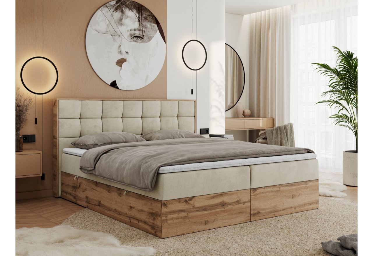 Główny materac kieszeniowy Multipocket dostarcza doskonałego wsparcia dla ciała, dzięki wysokoelastycznej piance T-30 co jest kluczowe dla zdrowego snu. Jego konstrukcja z niezależnymi kieszeniami minimalizuje przenoszenie ruchu. Dodatkowo, materac nawierzchniowy wykończony pianką T-25 zapewnia uczucie miękkości i komfortu, dostosowując się do kształtu ciała. Dwa pojemniki na pościel to praktyczne rozwiązanie, które pozwoli na łatwe przechowywanie pościeli i utrzymanie porządku. Automat na sprężynach sprawia, że otwieranie pojemników jest wygodne i szybkie. Tapicerowany zagłówek to prawdziwa ozdoba, która dodaje wnętrzu klasy i staje się centralnym punktem każdej sypialni. Łóżko kontynentalne posiada drewniane wykończenie na skrzyni oraz ramie wezgłowia. Dodaje wnętrzu ciepła i stylu, a nowoczesny design sprawia, że idealnie wpisuje się w różnorodne aranżacje.