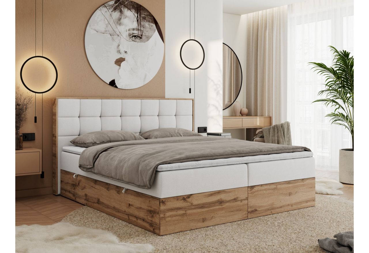Główny materac kieszeniowy Multipocket dostarcza doskonałego wsparcia dla ciała, dzięki wysokoelastycznej piance T-30 co jest kluczowe dla zdrowego snu. Jego konstrukcja z niezależnymi kieszeniami minimalizuje przenoszenie ruchu. Dodatkowo, materac nawierzchniowy wykończony pianką T-25 zapewnia uczucie miękkości i komfortu, dostosowując się do kształtu ciała. Dwa pojemniki na pościel to praktyczne rozwiązanie, które pozwoli na łatwe przechowywanie pościeli i utrzymanie porządku. Automat na sprężynach sprawia, że otwieranie pojemników jest wygodne i szybkie. Tapicerowany zagłówek to prawdziwa ozdoba, która dodaje wnętrzu klasy i staje się centralnym punktem każdej sypialni. Łóżko kontynentalne posiada drewniane wykończenie na skrzyni oraz ramie wezgłowia. Dodaje wnętrzu ciepła i stylu, a nowoczesny design sprawia, że idealnie wpisuje się w różnorodne aranżacje.