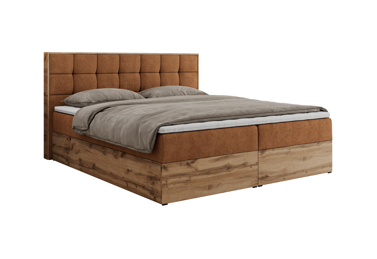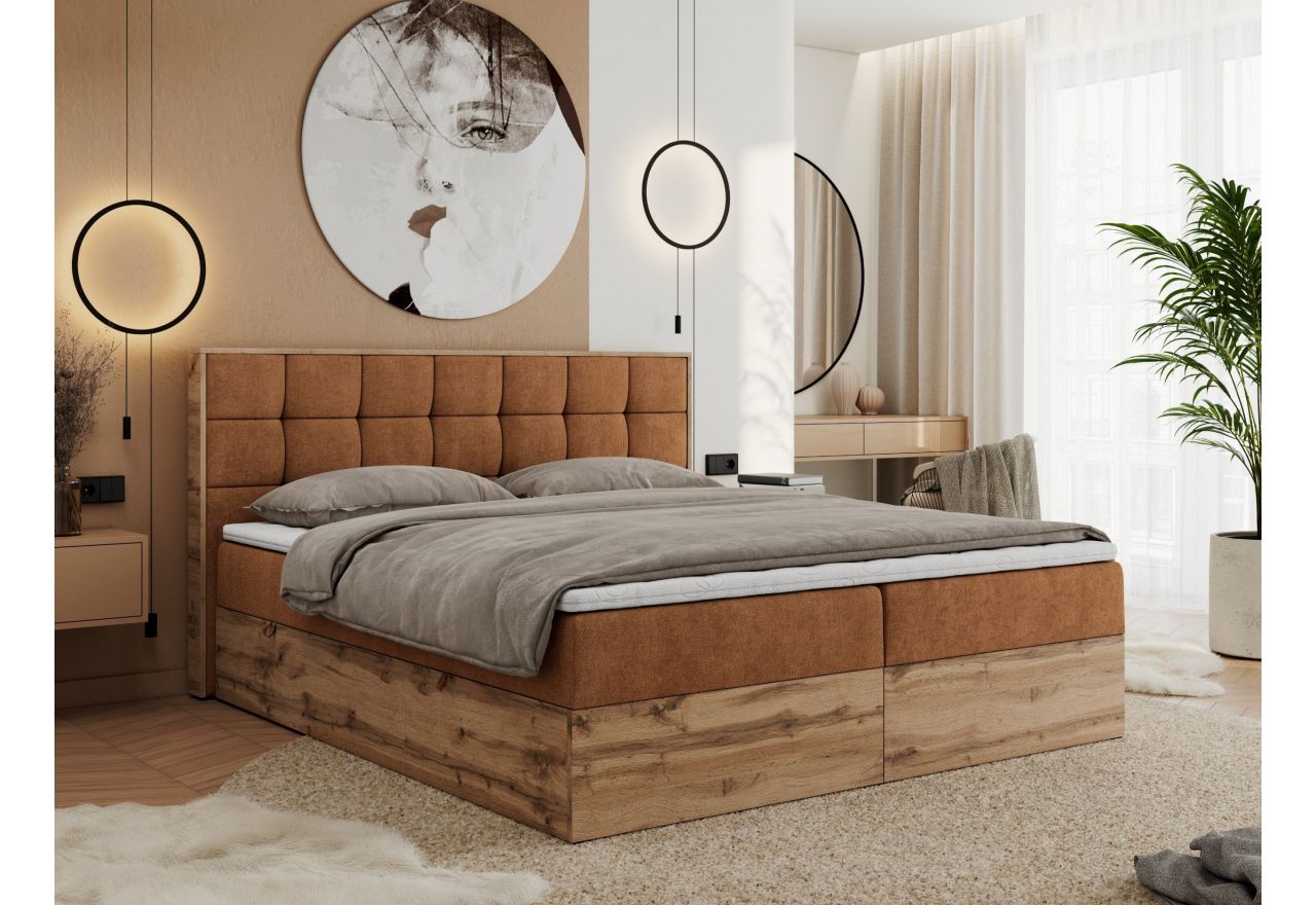 Główny materac kieszeniowy Multipocket dostarcza doskonałego wsparcia dla ciała, dzięki wysokoelastycznej piance T-30 co jest kluczowe dla zdrowego snu. Jego konstrukcja z niezależnymi kieszeniami minimalizuje przenoszenie ruchu. Dodatkowo, materac nawierzchniowy wykończony pianką T-25 zapewnia uczucie miękkości i komfortu, dostosowując się do kształtu ciała. Dwa pojemniki na pościel to praktyczne rozwiązanie, które pozwoli na łatwe przechowywanie pościeli i utrzymanie porządku. Automat na sprężynach sprawia, że otwieranie pojemników jest wygodne i szybkie. Tapicerowany zagłówek to prawdziwa ozdoba, która dodaje wnętrzu klasy i staje się centralnym punktem każdej sypialni. Łóżko kontynentalne posiada drewniane wykończenie na skrzyni oraz ramie wezgłowia. Dodaje wnętrzu ciepła i stylu, a nowoczesny design sprawia, że idealnie wpisuje się w różnorodne aranżacje.
