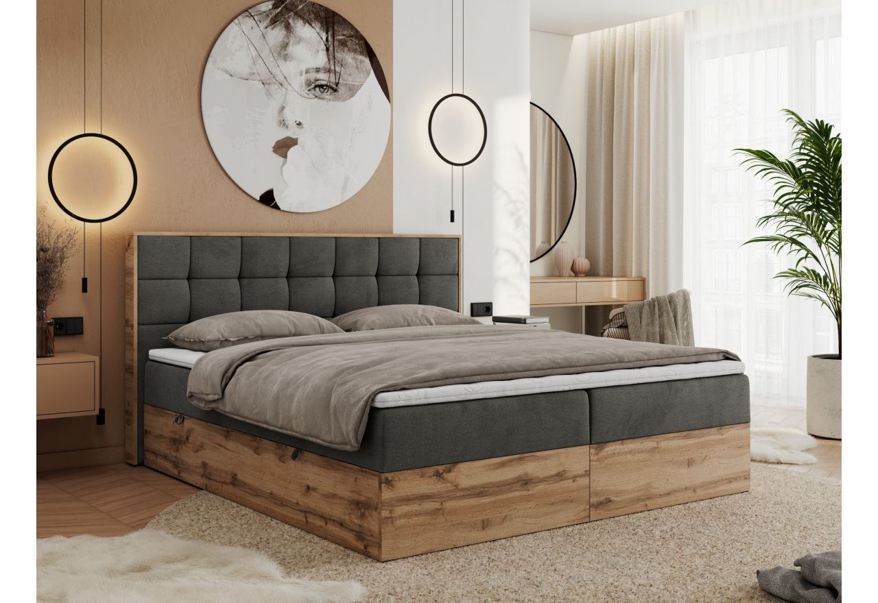 Główny materac kieszeniowy Multipocket dostarcza doskonałego wsparcia dla ciała, dzięki wysokoelastycznej piance T-30 co jest kluczowe dla zdrowego snu. Jego konstrukcja z niezależnymi kieszeniami minimalizuje przenoszenie ruchu. Dodatkowo, materac nawierzchniowy wykończony pianką T-25 zapewnia uczucie miękkości i komfortu, dostosowując się do kształtu ciała. Dwa pojemniki na pościel to praktyczne rozwiązanie, które pozwoli na łatwe przechowywanie pościeli i utrzymanie porządku. Automat na sprężynach sprawia, że otwieranie pojemników jest wygodne i szybkie. Tapicerowany zagłówek to prawdziwa ozdoba, która dodaje wnętrzu klasy i staje się centralnym punktem każdej sypialni. Łóżko kontynentalne posiada drewniane wykończenie na skrzyni oraz ramie wezgłowia. Dodaje wnętrzu ciepła i stylu, a nowoczesny design sprawia, że idealnie wpisuje się w różnorodne aranżacje.