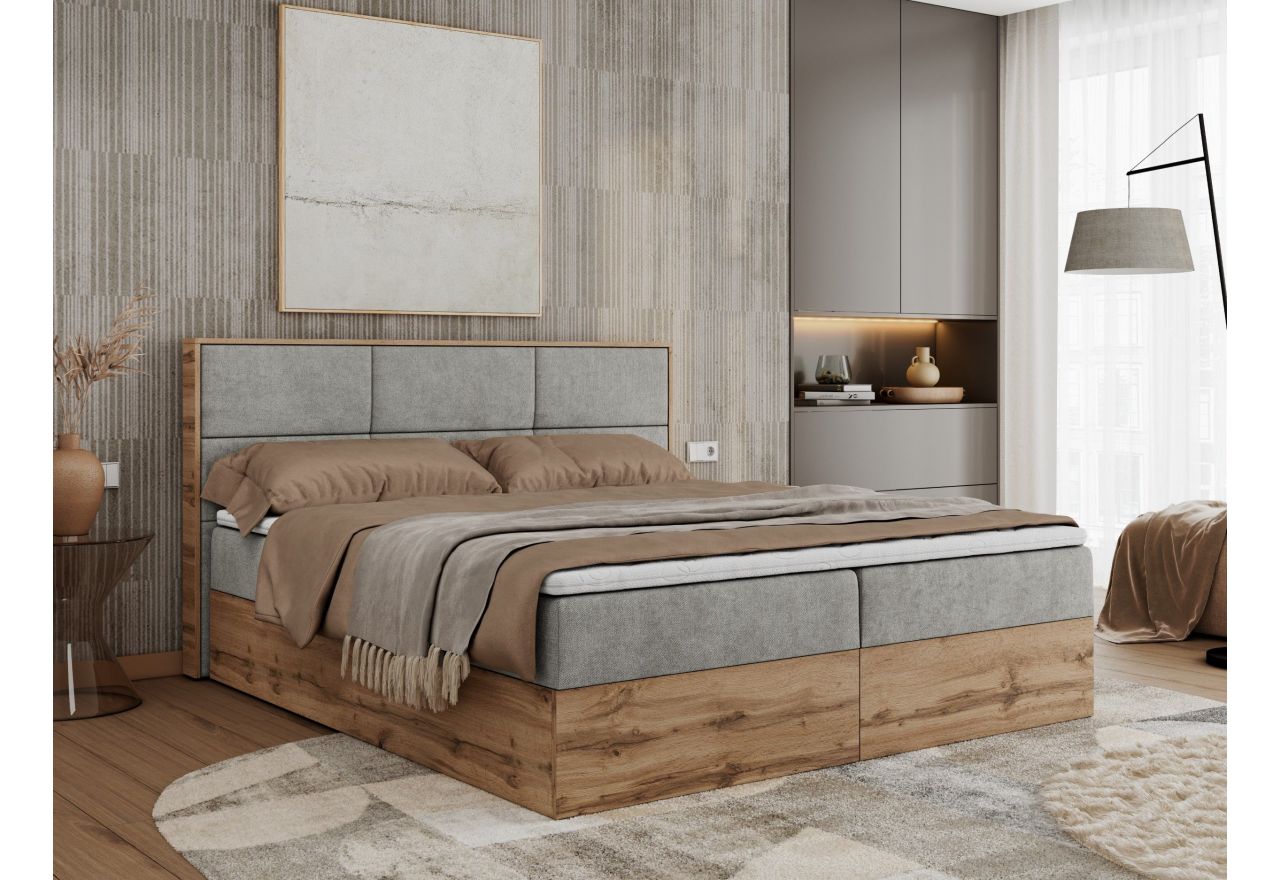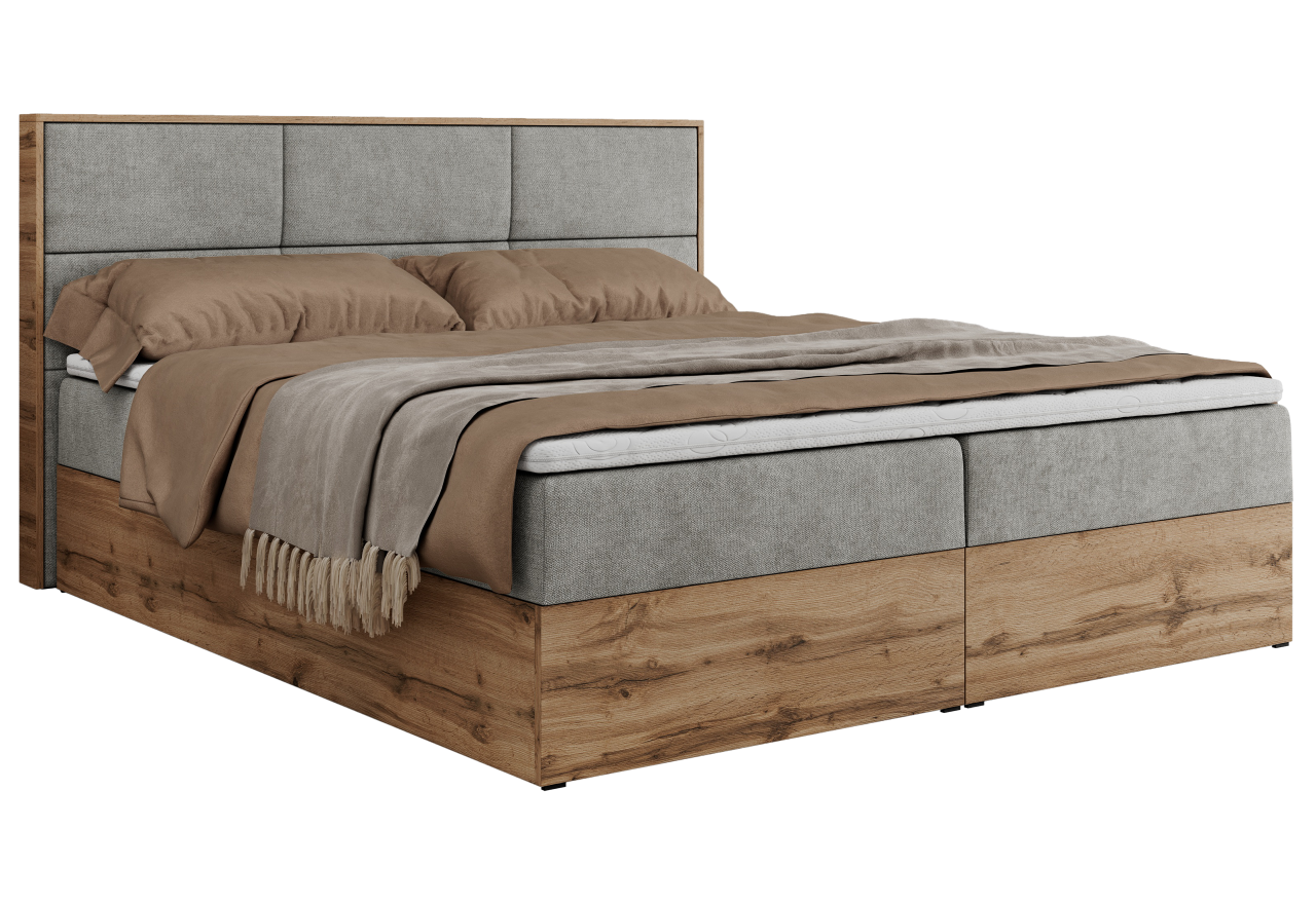 Główny materac kieszeniowy Multipocket dostarcza doskonałego wsparcia dla ciała, dzięki wysokoelastycznej piance T-30 co jest kluczowe dla zdrowego snu. Jego konstrukcja z niezależnymi kieszeniami minimalizuje przenoszenie ruchu. Dodatkowo, materac nawierzchniowy wykończony pianką T-25 zapewnia uczucie miękkości i komfortu, dostosowując się do kształtu ciała. Dwa pojemniki na pościel to praktyczne rozwiązanie, które pozwoli na łatwe przechowywanie pościeli i utrzymanie porządku. Automat na sprężynach sprawia, że otwieranie pojemników jest wygodne i szybkie. Tapicerowany zagłówek to prawdziwa ozdoba, która dodaje wnętrzu klasy i staje się centralnym punktem każdej sypialni. Łóżko kontynentalne posiada drewniane wykończenie na skrzyni oraz ramie wezgłowia. Dodaje wnętrzu ciepła i stylu, a nowoczesny design sprawia, że idealnie wpisuje się w różnorodne aranżacje.