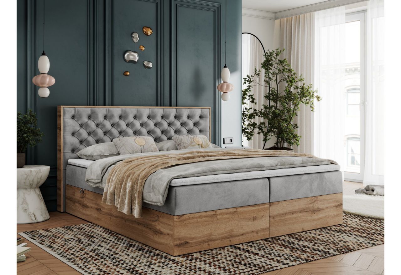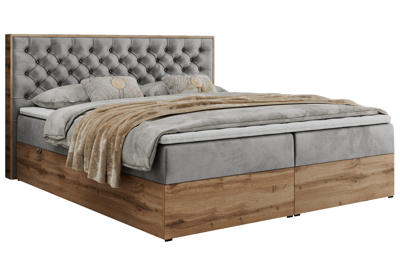 Główny materac kieszeniowy Multipocket dostarcza doskonałego wsparcia dla ciała, dzięki wysokoelastycznej piance T-30 co jest kluczowe dla zdrowego snu. Jego konstrukcja z niezależnymi kieszeniami minimalizuje przenoszenie ruchu. Dodatkowo, materac nawierzchniowy wykończony pianką T-25 zapewnia uczucie miękkości i komfortu, dostosowując się do kształtu ciała. Dwa pojemniki na pościel to praktyczne rozwiązanie, które pozwoli na łatwe przechowywanie pościeli i utrzymanie porządku. Automat na sprężynach sprawia, że otwieranie pojemników jest wygodne i szybkie. Tapicerowany zagłówek z dekoracyjnymi pikowaniami to prawdziwa ozdoba, która dodaje wnętrzu klasy i staje się centralnym punktem każdej sypialni. Łóżko kontynentalne posiada drewniane wykończenie na skrzyni oraz ramie wezgłowia. Dodaje wnętrzu ciepła i stylu, a nowoczesny design sprawia, że idealnie wpisuje się w różnorodne aranżacje.