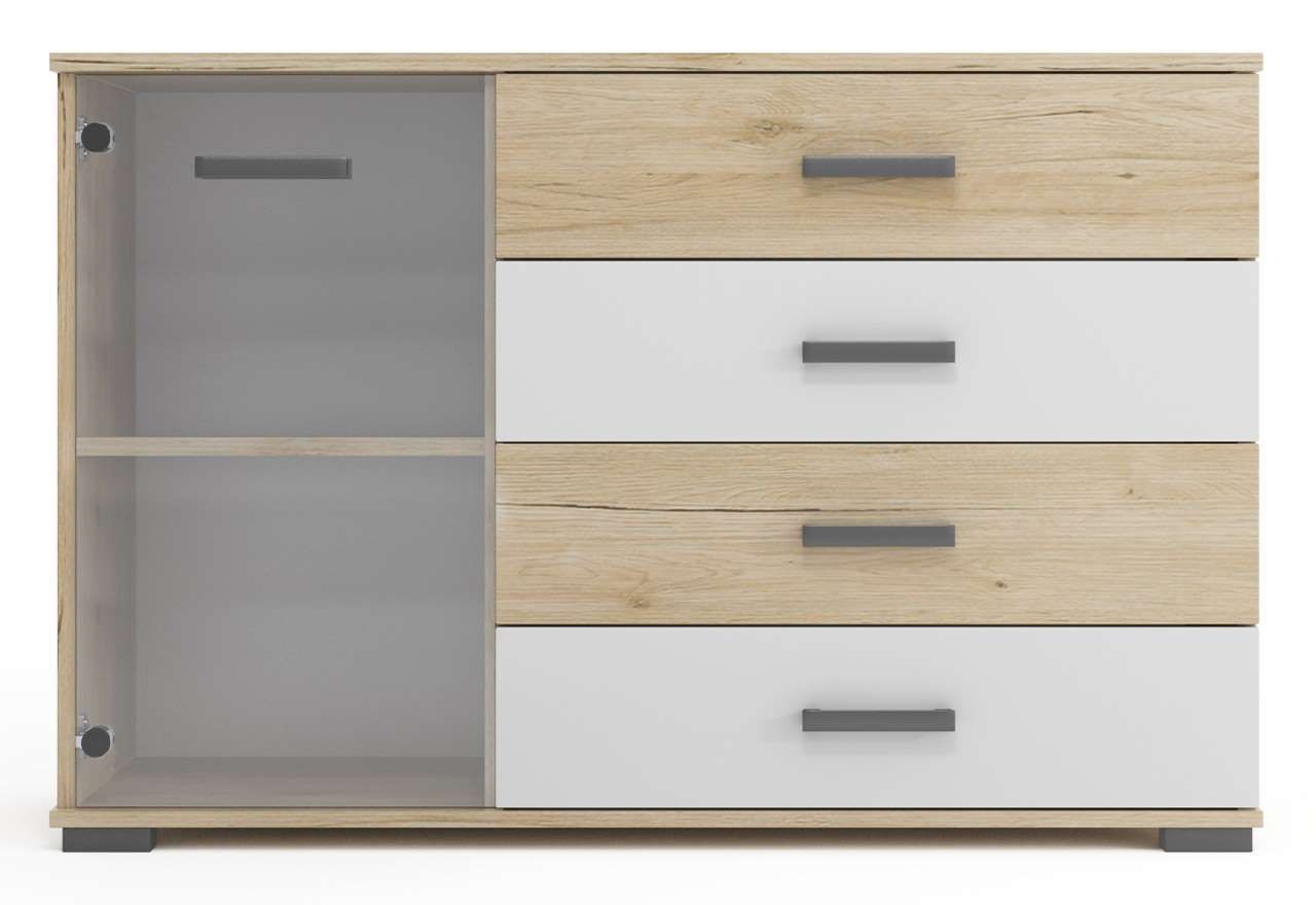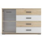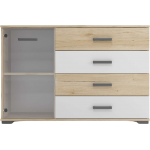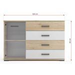 Chcesz spróbować czegoś nowego? Jeden kolor mebli nie jest dla Ciebie wystarczający? System LINK to zestaw brył, które zaprojektujesz według własnego upodobania. Zmień kolorystykę elementów i wstawek - jedyne co Cię ogranicza to wyobraźnia! Ponadczasowe ubarwienie sprawia, że mebel wpasuje się w każdą aranżację. Elegancka komoda 120 cm z czterema szufladami to wygodny sposób na schowanie ubrań, ale również dokumentów czy innych podręcznych rzeczy. Szybko i skutecznie pozbędziesz się bałaganu, jeśli przyjdą niezapowiedziani goście, dzięki pojemności szuflad. Po lewej stronie znajdziesz szklane drzwiczki oraz półkę za nimi. Całości dopełniają eleganckie nóżki i uchwyty, które nadają harmonii całokształtu aranżacji. Meble z serii LINK charakteryzują się wykonaniem z wysokiej jakości płyty laminowanej 18 mm. Gwarantuje to odporność na zarysowania, działanie promieni słonecznych oraz wilgoć. Specjalnie wyselekcjonowane i przygotowane materiały najlepszej klasy zapewniają Ci wieloletnie użytkowanie! Konstrukcja bryły świetnie będzie pasować do każdego wnętrza i wypełni je w praktyczny sposób. Meble z systemu LINK to nie tylko użyteczność, ale również klasa sama w sobie. Dzięki prostej formie i modernistycznemu wzornictwu odświeży Twój pokój i przykuje uwagę nie tylko gości.