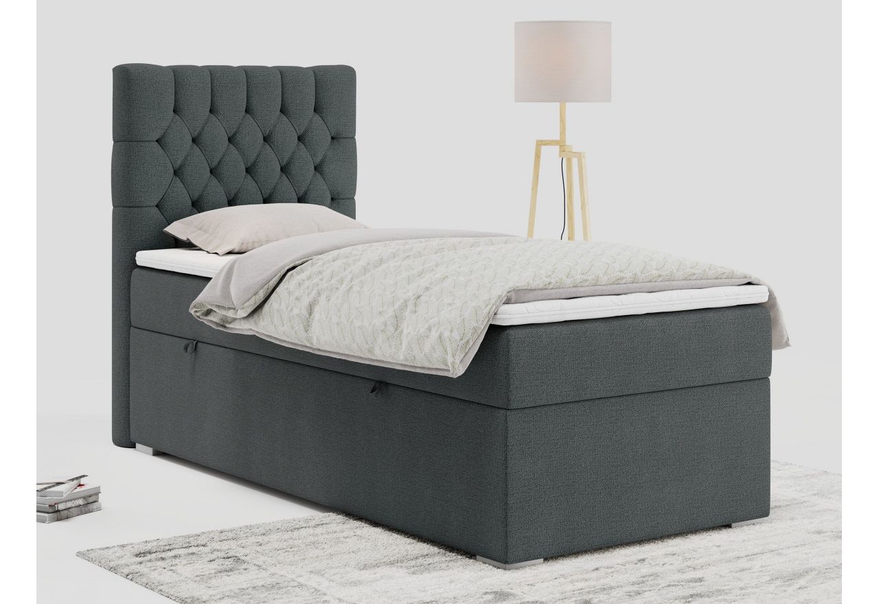 Łóżko kontynentalne PERA 90 łączy stylowy design z niezwykłą funkcjonalnością. Materac kieszeniowy z systemem 7 stref twardości oraz pianką wysokoelastyczną T-30 zapewnia optymalne wsparcie i komfort snu. Topper z pianki T-25 dodatkowo poprawia wygodę, idealnie dopasowując się do kształtu ciała i wyrównując powierzchnię spania. Praktyczny pojemnik na pościel pozwala na przechowywanie niezbędnych rzeczy, utrzymując porządek w pokoju. Mechanizm sprężynowy ułatwia otwieranie pojemnika, a elegancko pikowane wezgłowie nadaje wnętrzu nowoczesny charakter.