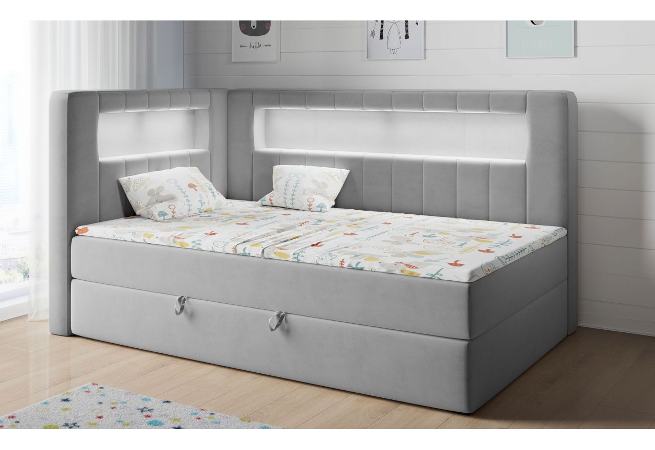 Główny materac kieszeniowy Pocket dostarcza doskonałego wsparcia dla ciała, dzięki wysokoelastycznej piance T-30 co jest kluczowe dla zdrowego snu. Jego konstrukcja z niezależnymi kieszeniami minimalizuje przenoszenie ruchu. Dodatkowo, materac nawierzchniowy wykończony pianką T-25 zapewnia uczucie miękkości i komfortu, dostosowując się do kształtu ciała. Pojemnik na pościel to praktyczne rozwiązanie, które pozwoli na łatwe przechowywanie pościeli i utrzymanie porządku. Automat na sprężynach sprawia, że otwieranie pojemnika jest wygodne i szybkie. Tapicerowany zagłówek razem z bokiem łóżka to prawdziwe ozdoby, które dodają wnętrzu klasy i stają się centralnym punktem każdej młodzieńczej sypialni. W wezgłowiu i boku znajduje się praktyczna wnęka z oświetleniem LED.