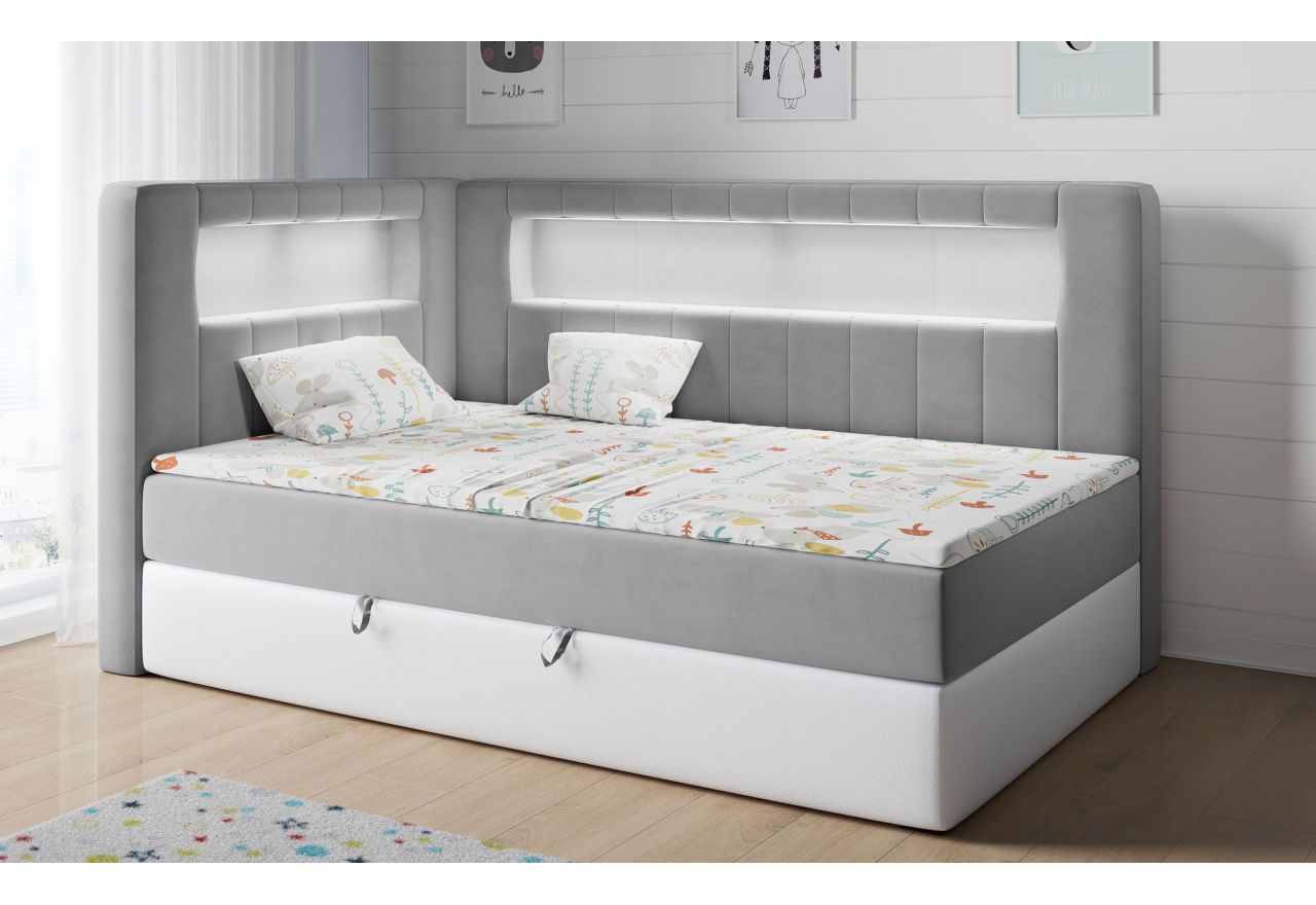 Główny materac kieszeniowy Pocket dostarcza doskonałego wsparcia dla ciała, dzięki wysokoelastycznej piance T-30 co jest kluczowe dla zdrowego snu. Jego konstrukcja z niezależnymi kieszeniami minimalizuje przenoszenie ruchu. Dodatkowo, materac nawierzchniowy wykończony pianką T-25 zapewnia uczucie miękkości i komfortu, dostosowując się do kształtu ciała. Pojemnik na pościel to praktyczne rozwiązanie, które pozwoli na łatwe przechowywanie pościeli i utrzymanie porządku. Automat na sprężynach sprawia, że otwieranie pojemnika jest wygodne i szybkie. Tapicerowany zagłówek razem z bokiem łóżka to prawdziwe ozdoby, które dodają wnętrzu klasy i stają się centralnym punktem każdej młodzieńczej sypialni. W wezgłowiu i boku znajduje się praktyczna wnęka z oświetleniem LED.