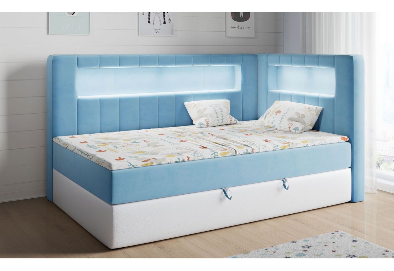 Główny materac kieszeniowy Pocket dostarcza doskonałego wsparcia dla ciała, dzięki wysokoelastycznej piance T-30 co jest kluczowe dla zdrowego snu. Jego konstrukcja z niezależnymi kieszeniami minimalizuje przenoszenie ruchu. Dodatkowo, materac nawierzchniowy wykończony pianką T-25 zapewnia uczucie miękkości i komfortu, dostosowując się do kształtu ciała. Pojemnik na pościel to praktyczne rozwiązanie, które pozwoli na łatwe przechowywanie pościeli i utrzymanie porządku. Automat na sprężynach sprawia, że otwieranie pojemnika jest wygodne i szybkie. Tapicerowany zagłówek razem z bokiem łóżka to prawdziwe ozdoby, które dodają wnętrzu klasy i stają się centralnym punktem każdej młodzieńczej sypialni. W wezgłowiu i boku znajduje się praktyczna wnęka z oświetleniem LED.